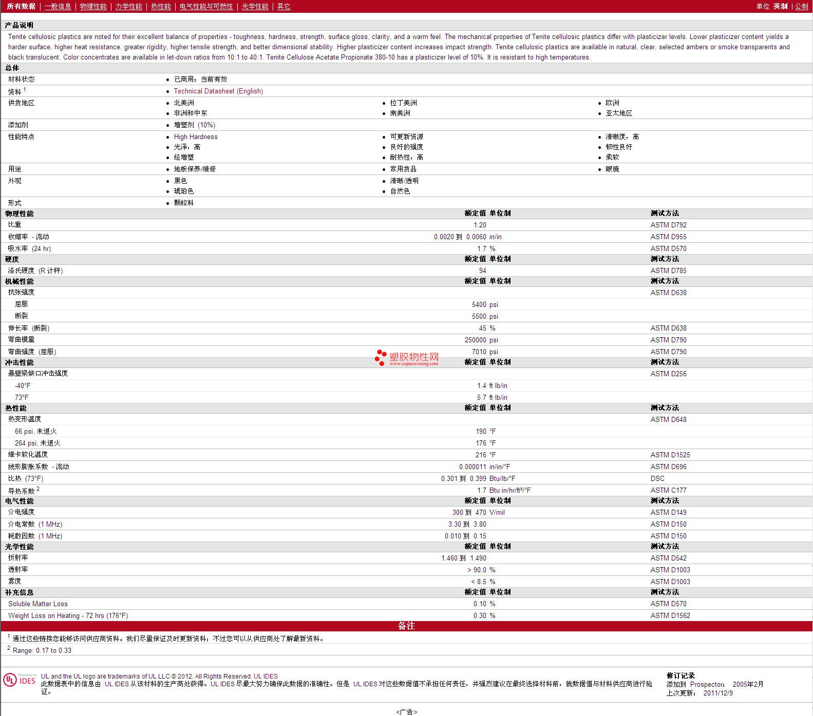 需了解Tenite Propionate CAP 380A4000010 Clear Trsp 物性表更多详情,材质证明、ROHS(SGS)报告、物质安全资料表(MSDS)、UL黄卡等,最新行情报价等可来电咨询:赵先生:13424755533或QQ: 27660005