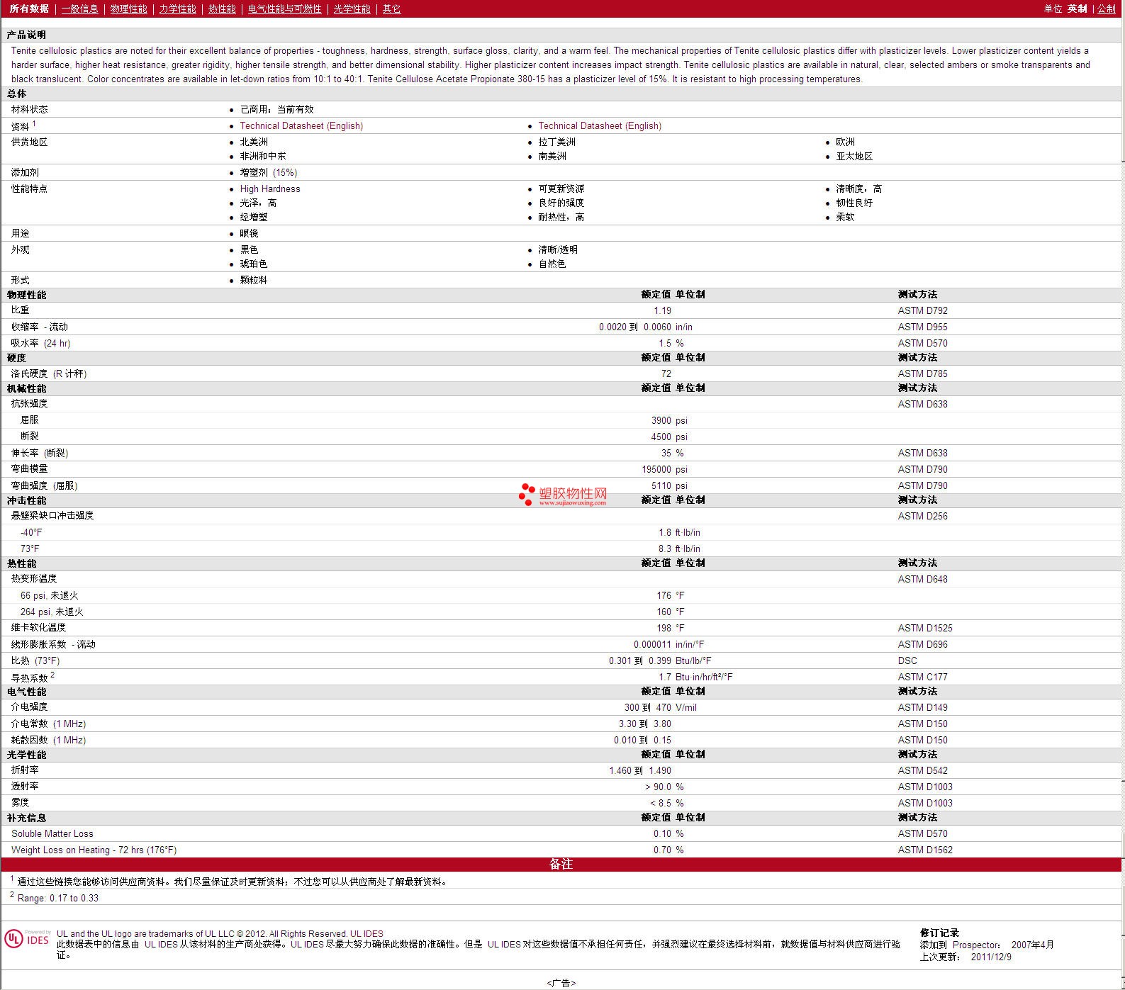 更多Tenite Propionate CAP 380A4000015 Clear Trsp 物性表报价,图片、材质证明、UL黄卡、物质安全资料表(MSDS)等可来电咨询赵先生:13424755533或QQ: 27660005