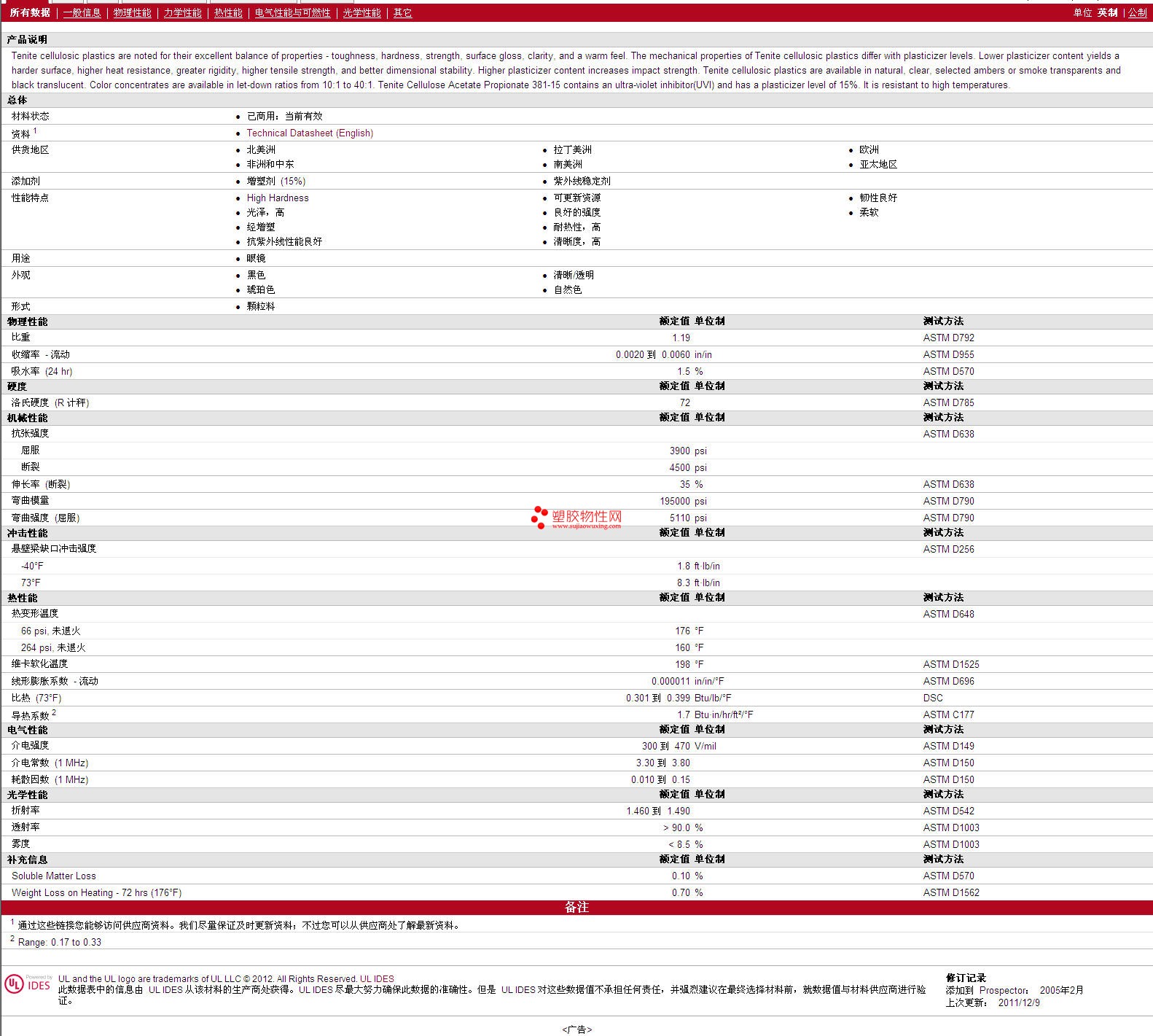 需了解Tenite Propionate CAP 381E4000015 Clear Trsp 物性表更多详情,材质证明、ROHS(SGS)报告、物质安全资料表(MSDS)、UL黄卡等,最新行情报价等可来电咨询:赵先生:13424755533或QQ: 27660005