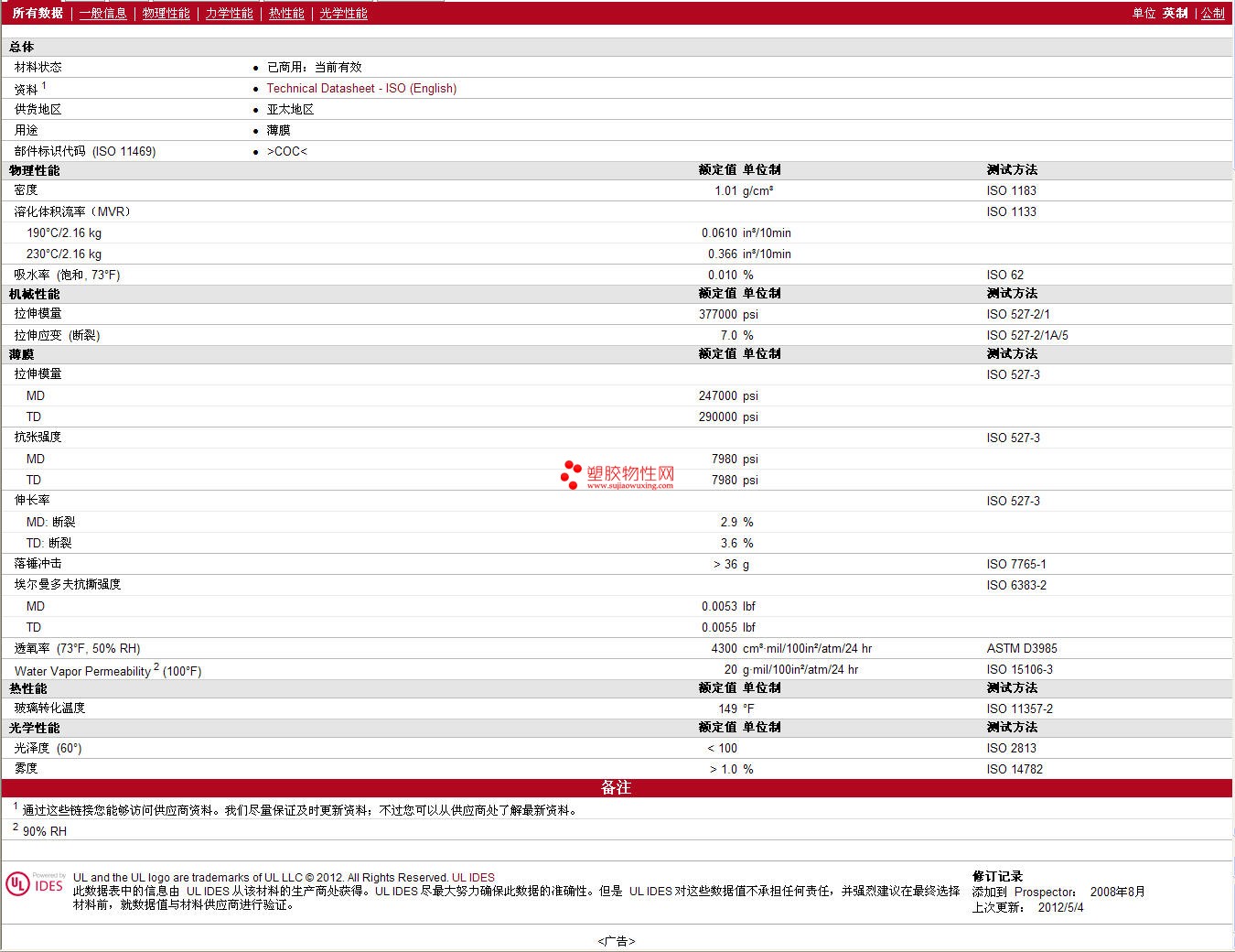 更多Topas COC 9506F-04物性表图片,报价、物质安全资料表(MSDS)、材质证明、UL黄卡等,最新行情报价等可来电咨询赵先生:13424755533 或QQ:27660005