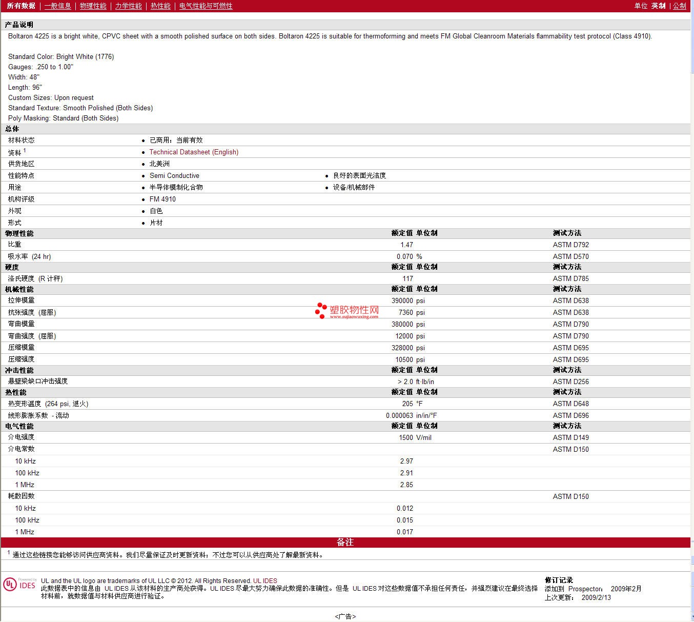 Boltaron 4225 FM4910 CPVC 物性表报价,图片、材质证明、UL黄卡、物质安全资料表(MSDS)等可来电咨询赵先生:13424755533 或QQ:27660005
