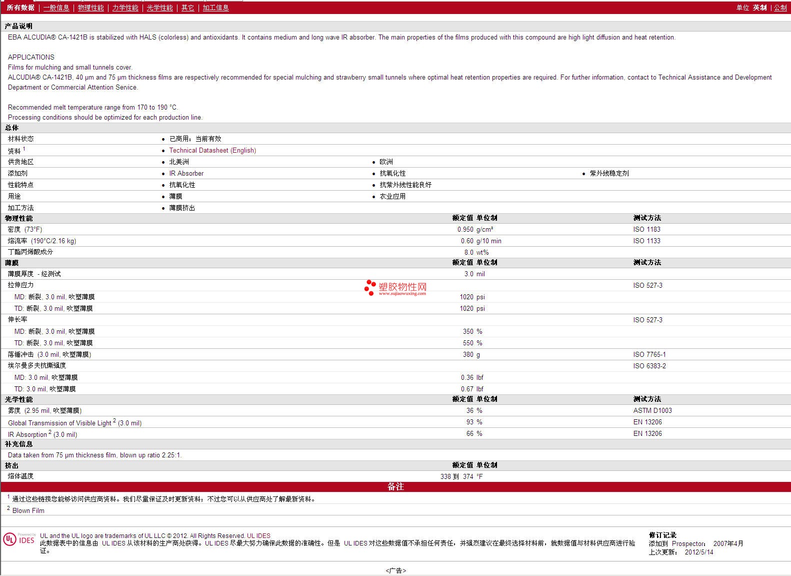 如需了解ALCUDIA EBA CA-1421B 物性表更多详情,ROHS(SGS)报告、物质安全资料表(MSDS)、材质证明、UL黄卡等,最新行情报价等可来电咨询:赵先生:13424755533或QQ: 27660005