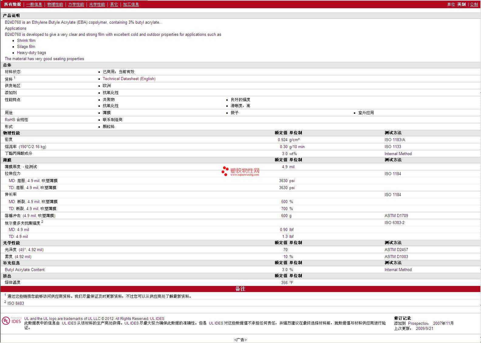 如需了解INEOS Wire EBA Cable B24D760 物性表更多详情,ROHS(SGS)报告、物质安全资料表(MSDS)、材质证明、UL黄卡等,最新行情报价等可来电咨询:赵先生:13424755533或QQ: 27660005