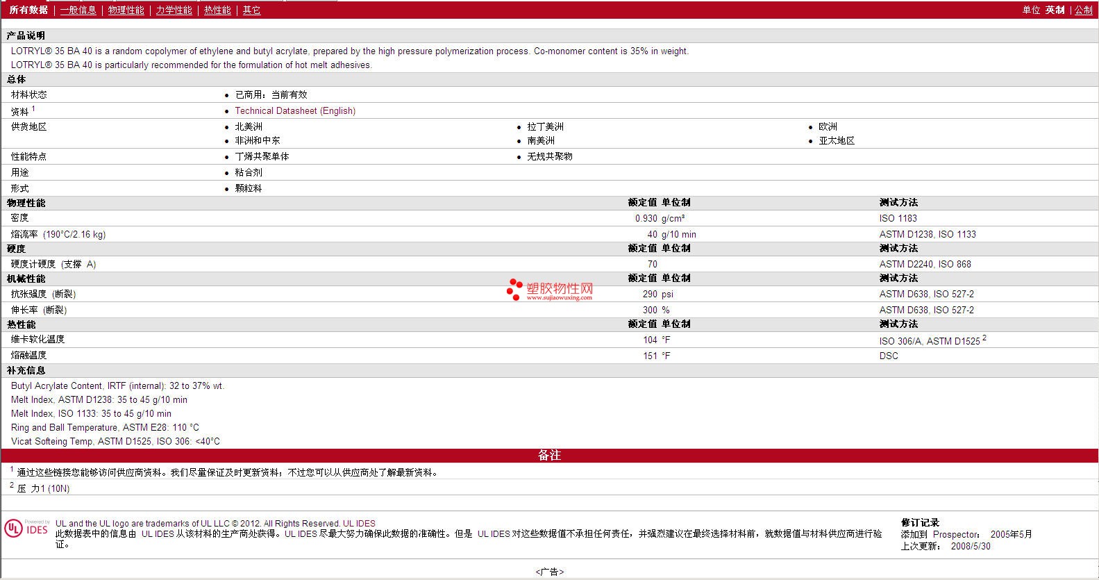如需了解Lotryl EBA 35 BA 40 物性表更多详情,ROHS(SGS)报告、物质安全资料表(MSDS)、材质证明、UL黄卡等,最新行情报价等可来电咨询:赵先生:13424755533或QQ: 27660005