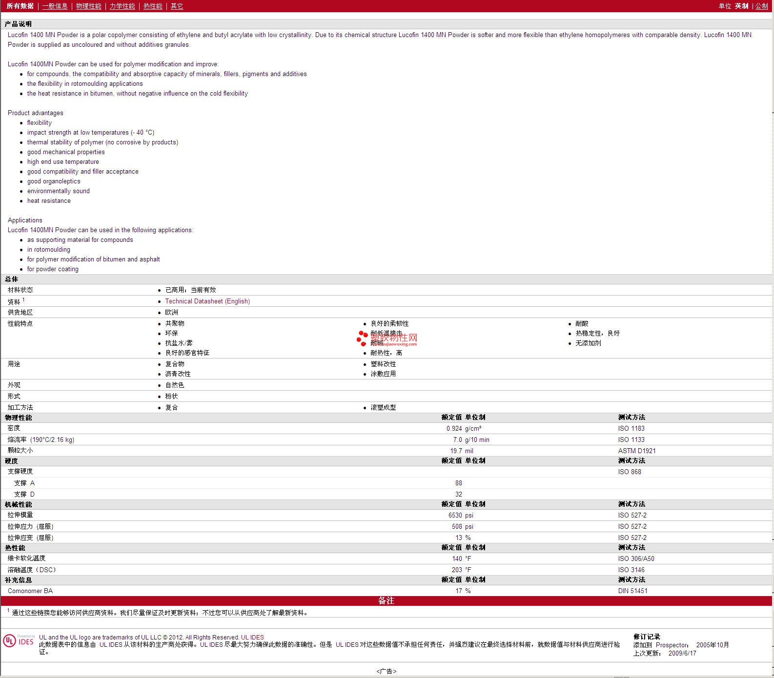 更多Lucofin EBA 1400MN Powder 物性表报价,图片、材质证明、UL黄卡、物质安全资料表(MSDS)等,最新行情报价等可来电咨询赵先生:13424755533或QQ: 27660005