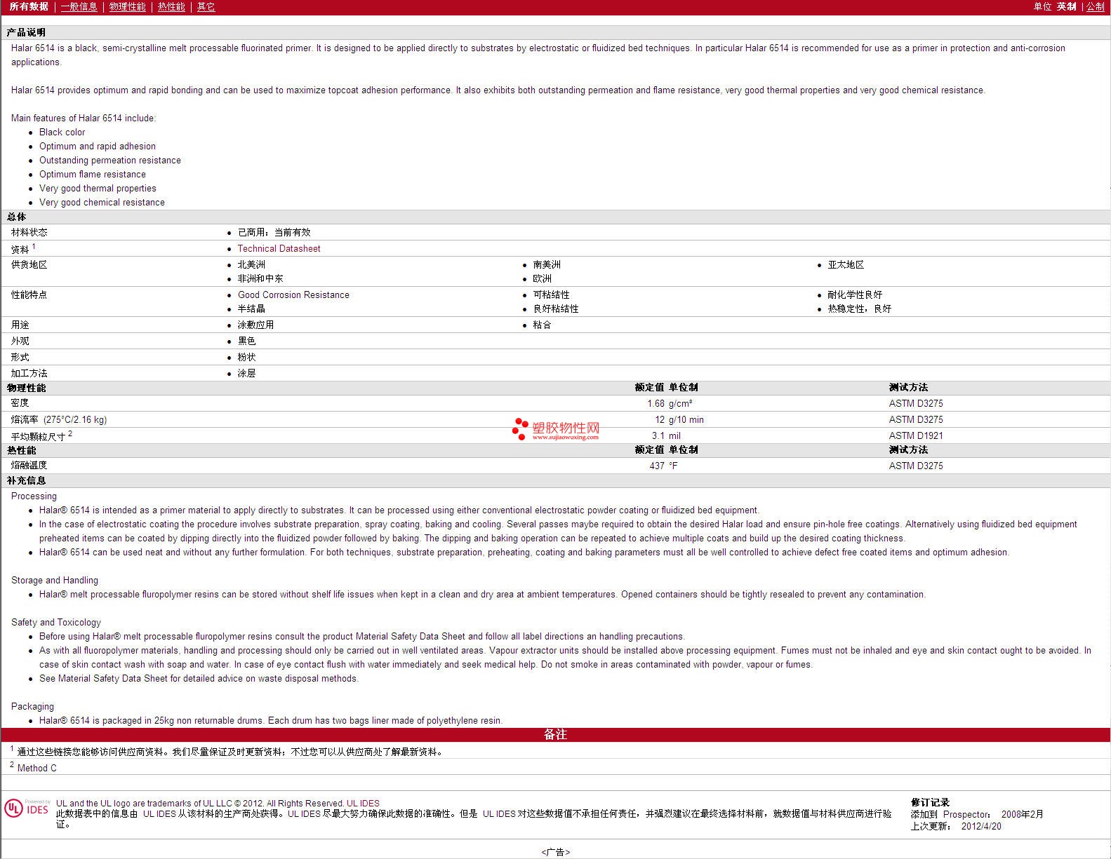 更多Halar ECTFE 6514 物性表报价,图片、材质证明、UL黄卡、物质安全资料表(MSDS)等可来电咨询赵先生:13424755533或QQ: 27660005
