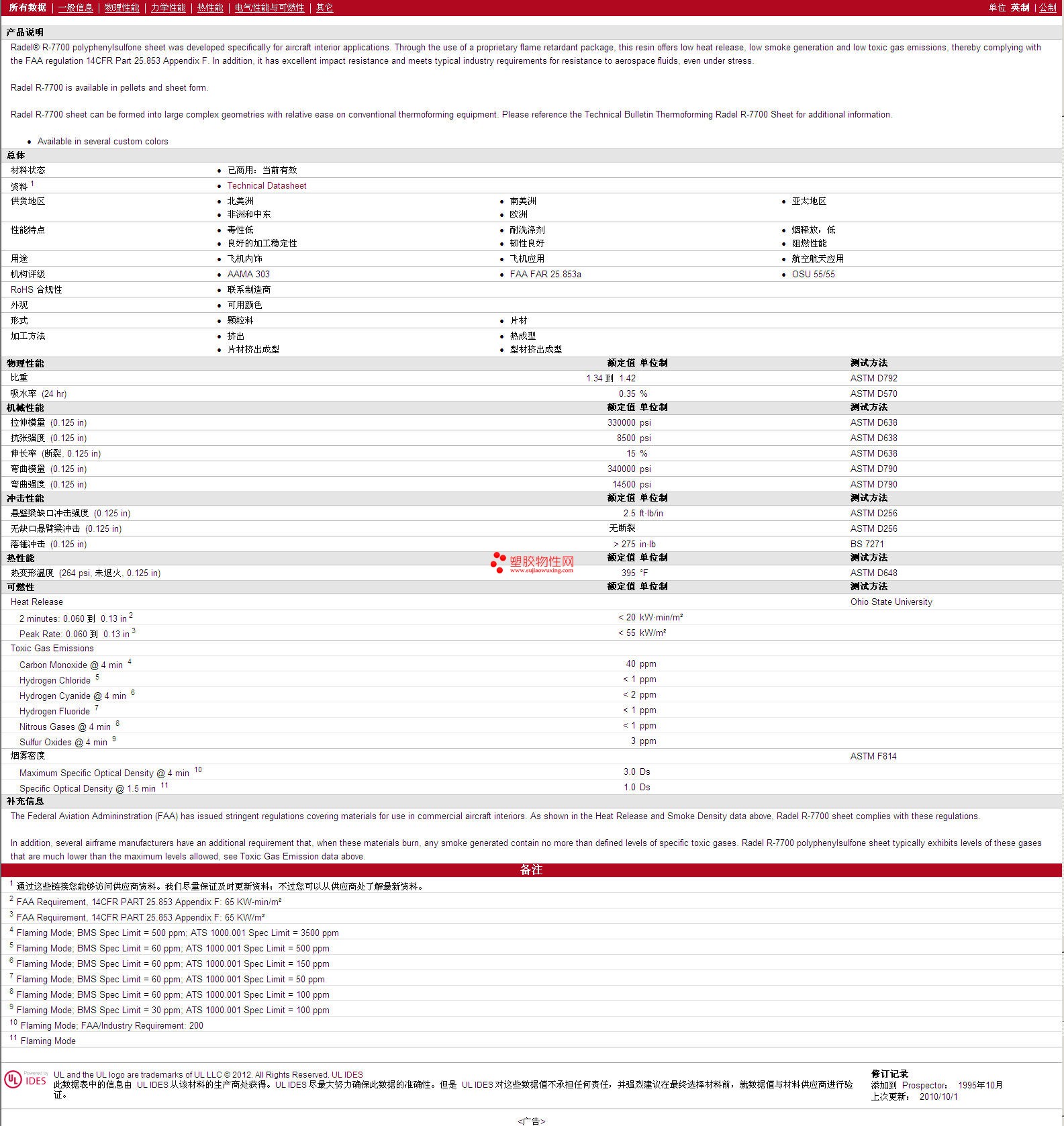 需了解Radel PPSU R-7700 物性表更多详情,材质证明、ROHS(SGS)报告、物质安全资料表(MSDS)、UL黄卡等,最新行情报价等可来电咨询:赵先生:13424755533或QQ: 27660005