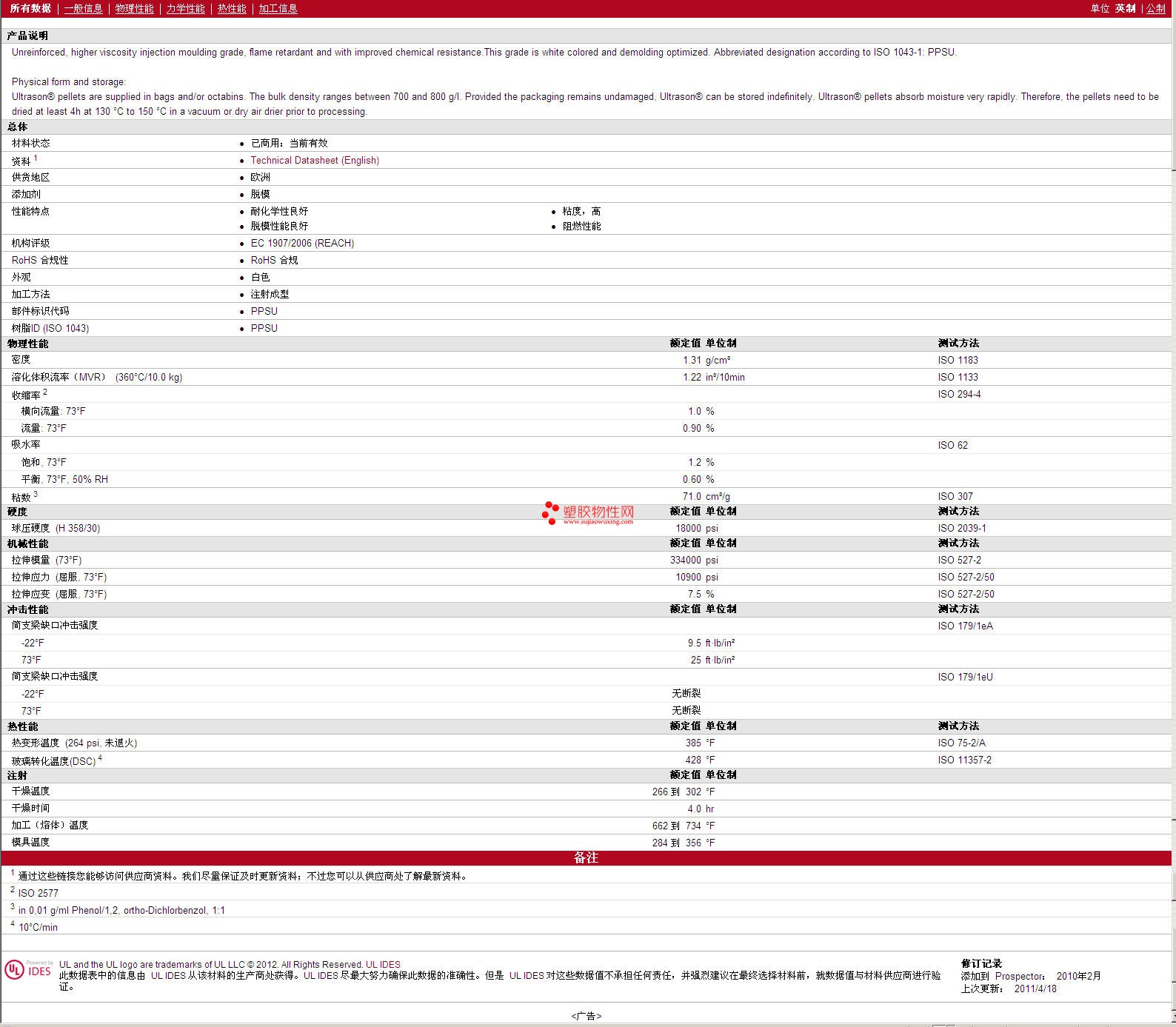 如需了解Ultrason PPSU P 3010 MR SW 20264 物性表更多详情,ROHS(SGS)报告、物质安全资料表(MSDS)、材质证明、UL黄卡等,最新行情报价等可来电咨询:赵先生:13424755533或QQ: 27660005