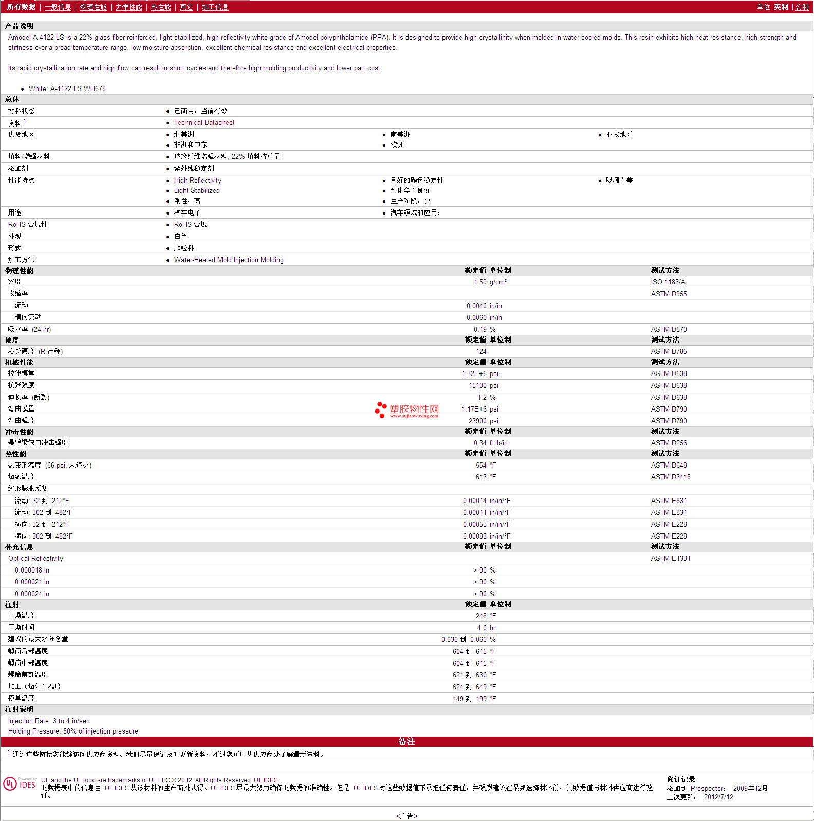 更多 Amodel PPA A-4122 LS WH678 物性表报价,图片、材质证明、UL黄卡、物质安全资料表(MSDS)等可来电咨询赵先生:13424755533或QQ: 27660005