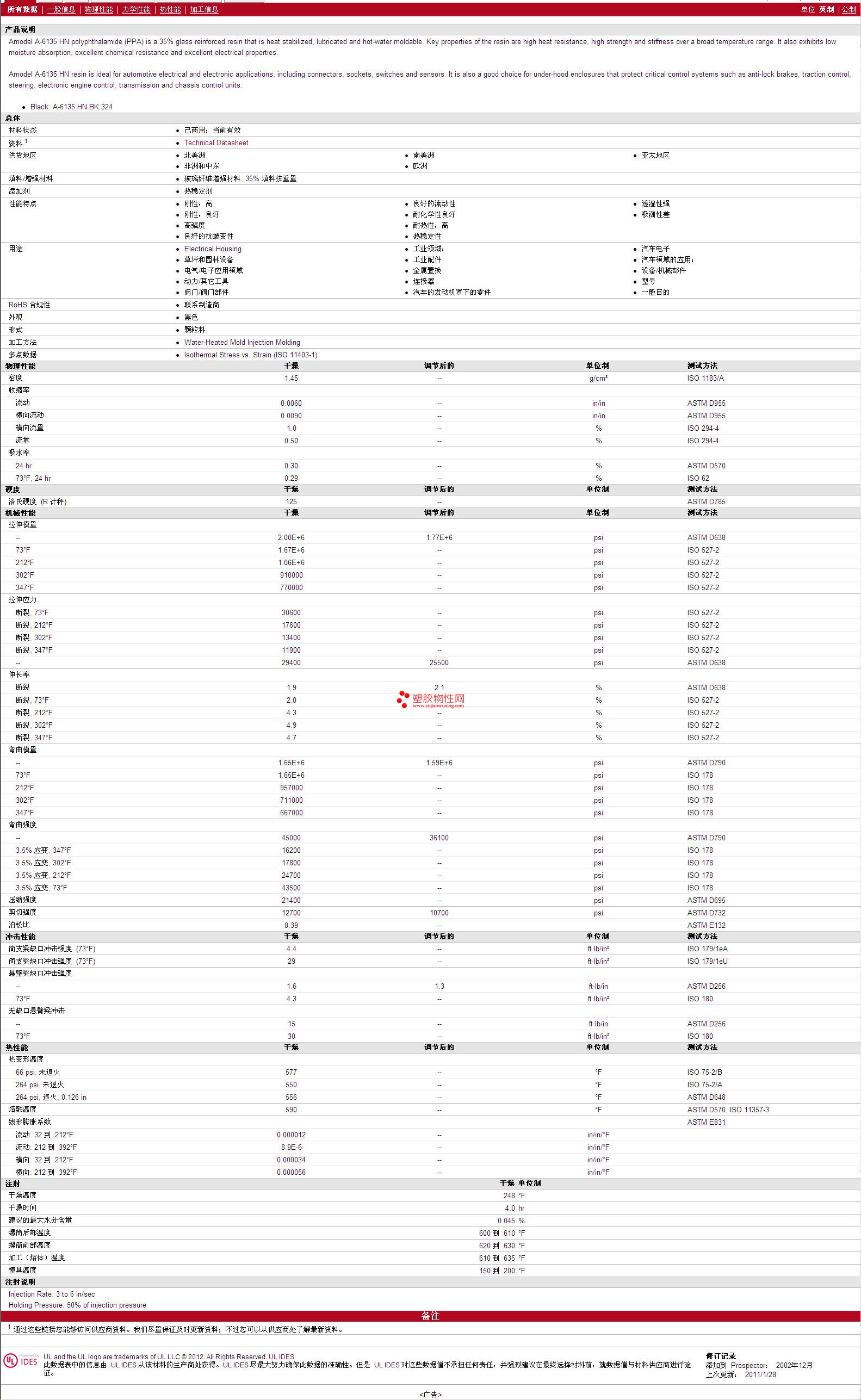 如需了解Amodel PPA A-6135 HN 物性表更多详情,ROHS(SGS)报告、物质安全资料表(MSDS)、材质证明、UL黄卡等,最新行情报价等可来电咨询:赵先生:13424755533或QQ: 27660005