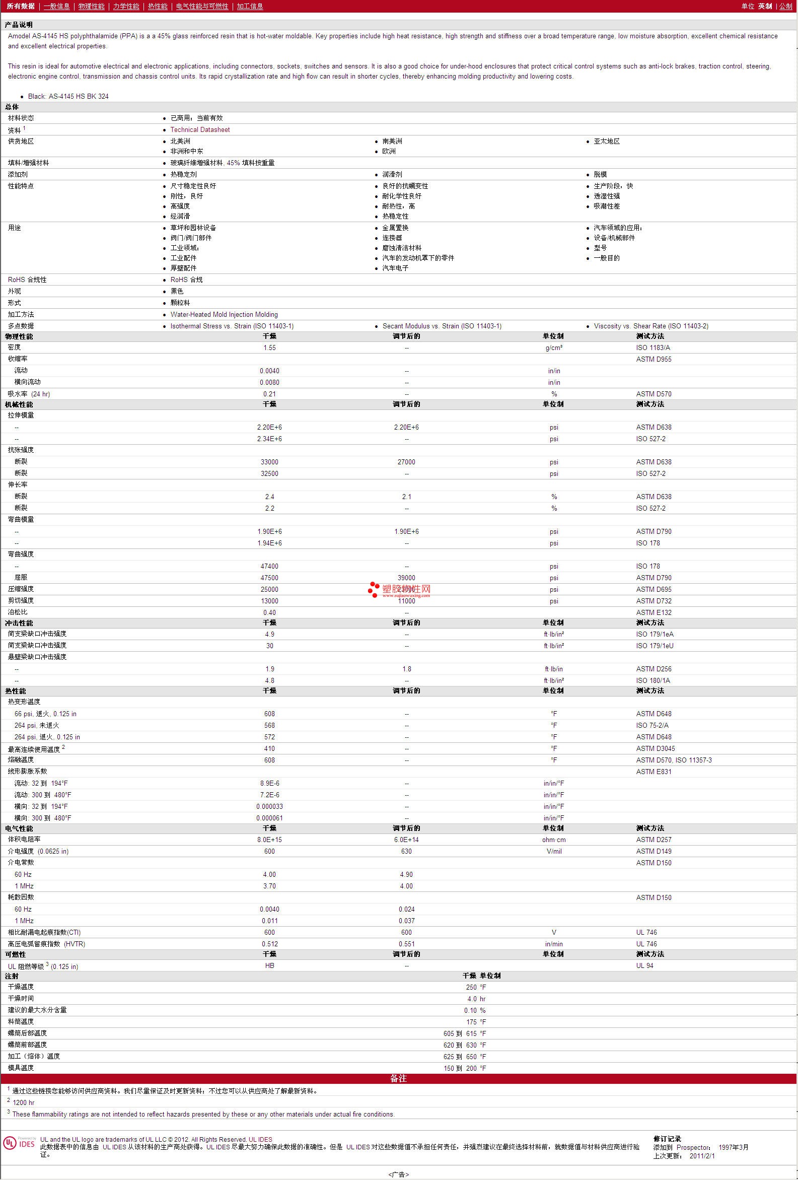 更多Amodel PPA AS-4145 HS 物性表报价,图片、材质证明、UL黄卡、物质安全资料表(MSDS)等可来电咨询赵先生:13424755533或QQ: 27660005