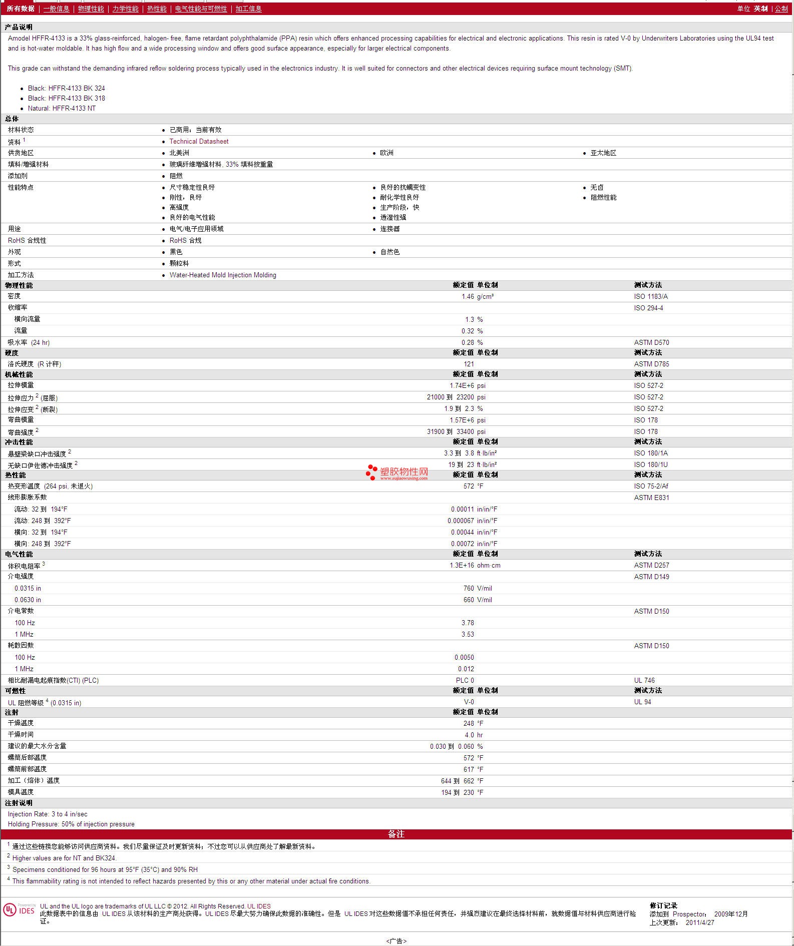 需了解Amodel PPA HFFR-4133 物性表材质证明、ROHS(SGS)报告、物质安全资料表(MSDS)、UL黄卡等可来电咨询:赵先生:13424755533或QQ: 27660005