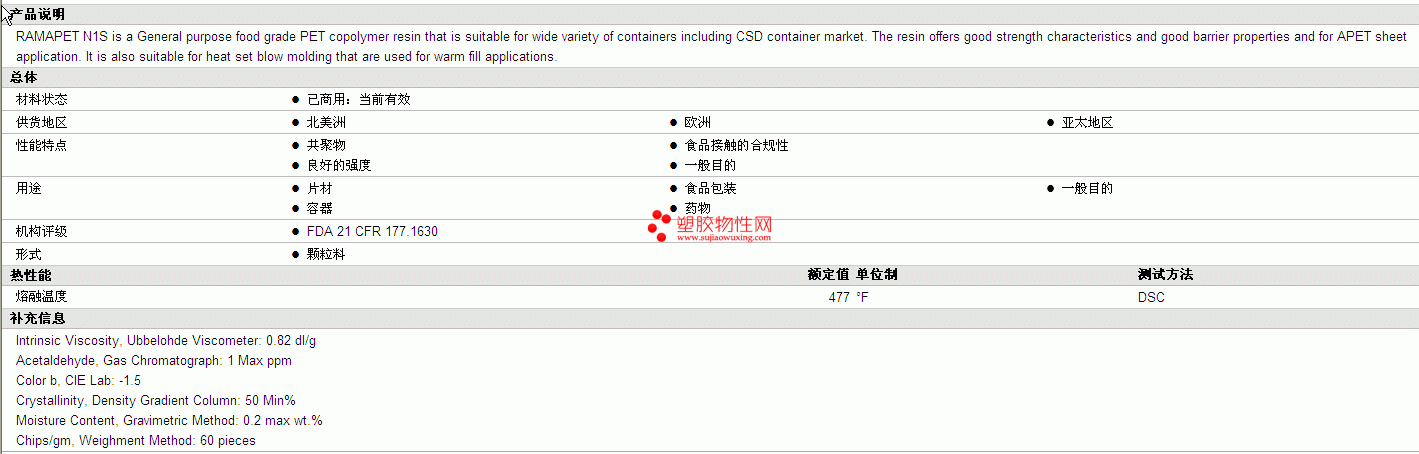 更多RAMAPET PET N1S物性表报价,图片、材质证明、UL黄卡、物质安全资料表(MSDS)等,最新行情报价等可来电咨询赵先生:13424755533。或QQ:27660005
