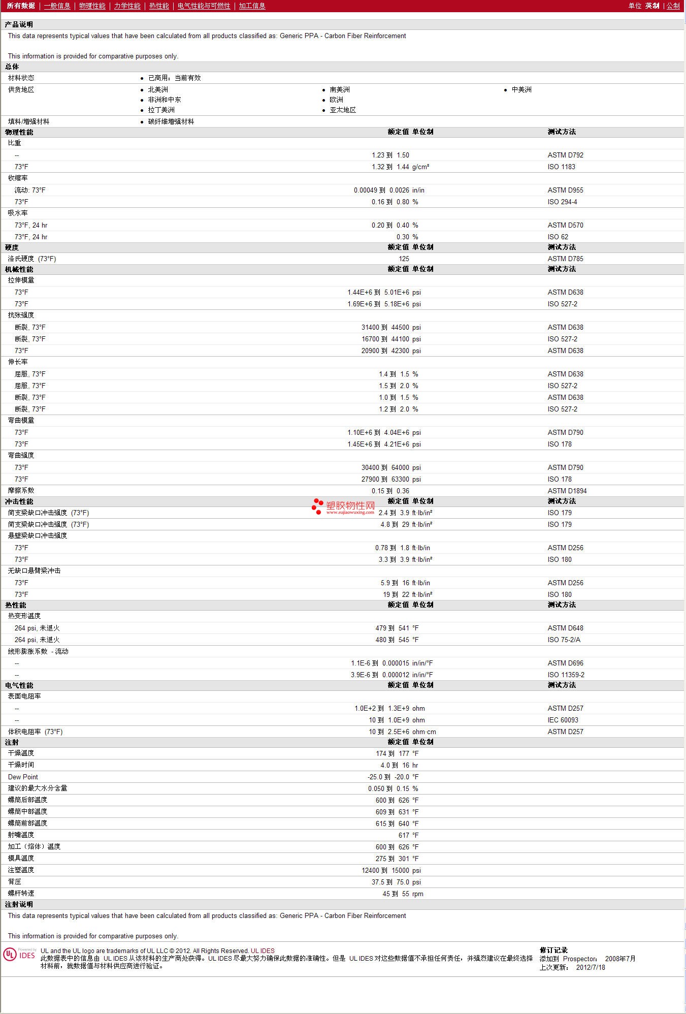 如需了解Generic PPA - Carbon Fiber Reinforcement物性表更多详情,ROHS(SGS)报告、物质安全资料表(MSDS)、材质证明、UL黄卡等,最新行情报价等可来电咨询:赵先生:13424755533 或QQ:27660005