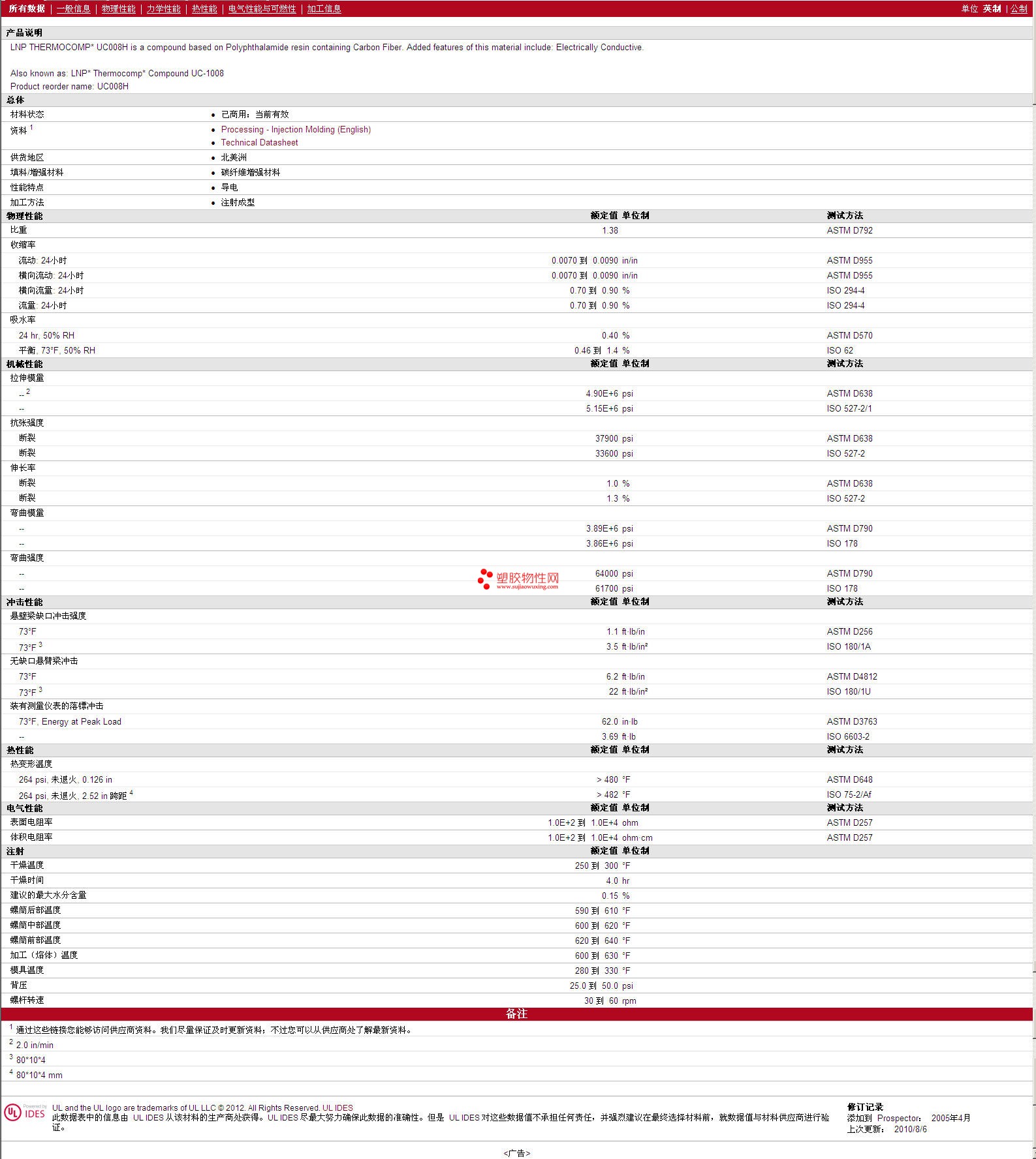 需了解LNP Thermocomp PPA UC008H 物性表更多详情,材质证明、ROHS(SGS)报告、物质安全资料表(MSDS)、UL黄卡等,最新行情报价等可来电咨询:赵先生:13424755533或QQ: 27660005