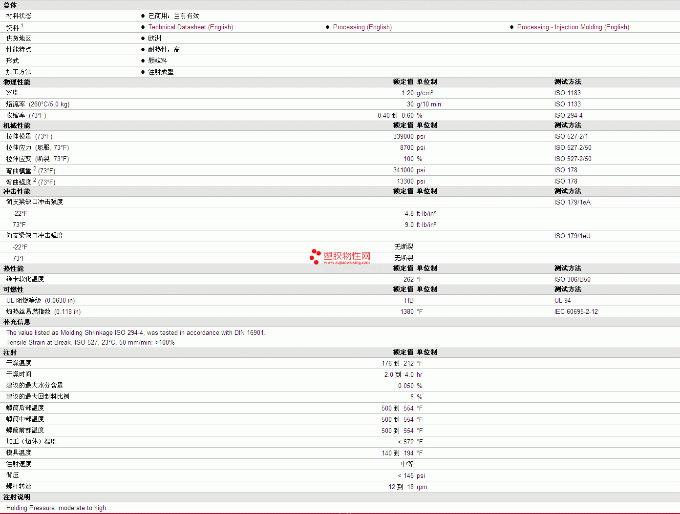 | 拉伸模量 (73°F) | 339000 | psi | ISO 527-2/1 |