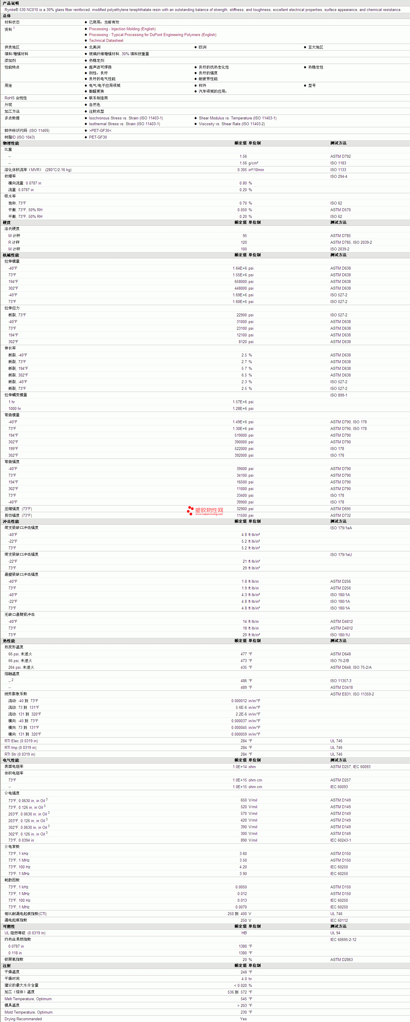 如需了解Rynite PET 530 NC010 物性表更多详情,ROHS(SGS)报告、物质安全资料表(MSDS)、材质证明、UL黄卡等,最新行情报价等可来电咨询:赵先生:13424755533。或QQ:27660005