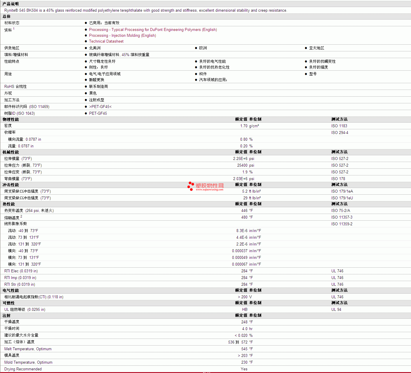 Rynite PET 545 BK504 物性表 详细情况如图