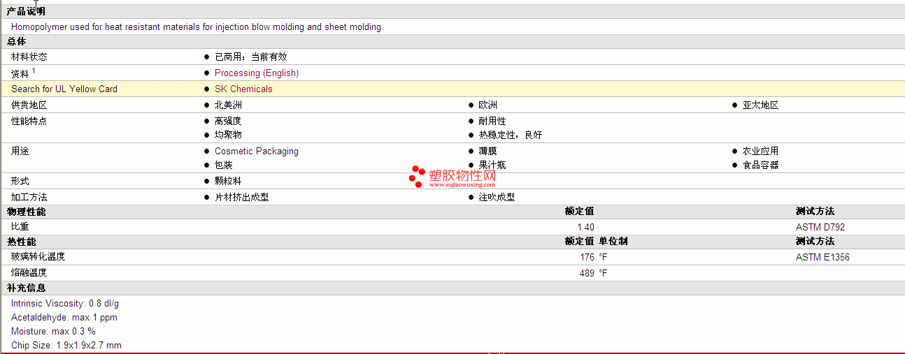 需了解SKYPET PET BB 8055物性表更多详情,材质证明、ROHS(SGS)报告、物质安全资料表(MSDS)、UL黄卡等,最新行情报价等可来电咨询:赵先生:13424755533。或QQ:27660005