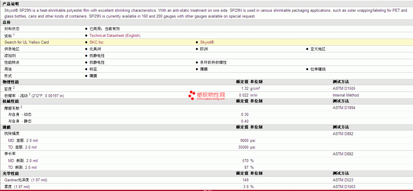 需了解Skyrol PET SP29N物性表更多详情,材质证明、ROHS(SGS)报告、物质安全资料表(MSDS)、UL黄卡等,最新行情报价等可来电咨询:赵先生:13424755533。或QQ:27660005