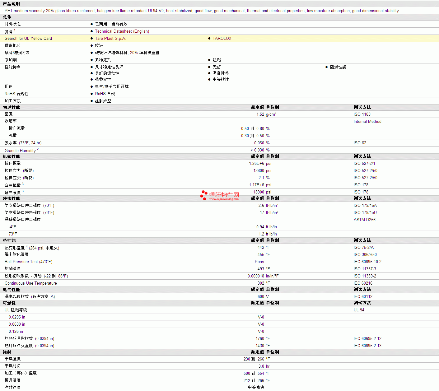 如需了解TAROLOX PET 111 G4 Y0物性表更多详情,ROHS(SGS)报告、物质安全资料表(MSDS)、材质证明、UL黄卡等,最新行情报价等可来电咨询:赵先生:13424755533。或QQ:27660005