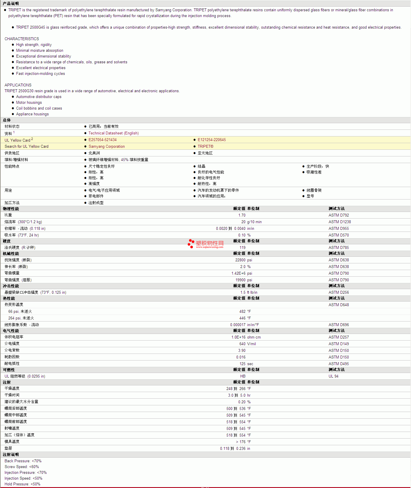 更多TRIPET PET 2500G45物性表报价,图片、材质证明、UL黄卡、物质安全资料表(MSDS)等可来电咨询赵先生:13424755533。或QQ:27660005