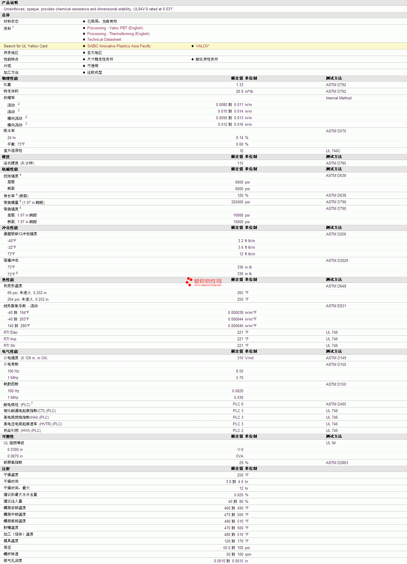 如需了解VALOX PET 365 Resin物性表更多详情,ROHS(SGS)报告、物质安全资料表(MSDS)、材质证明、UL黄卡等,最新行情报价等可来电咨询:赵先生:13424755533。或QQ:27660005