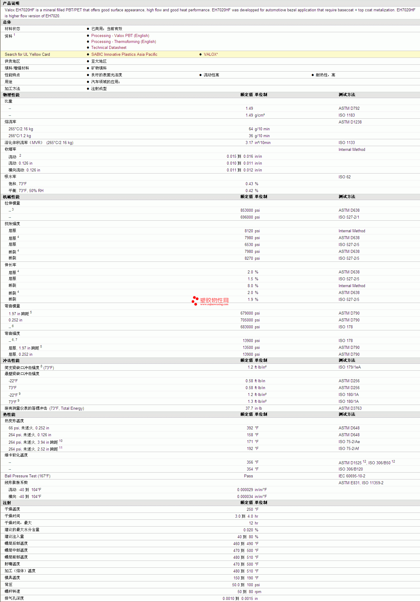 VALOX PET EH7020HF Resin 物性表 更多资料见图