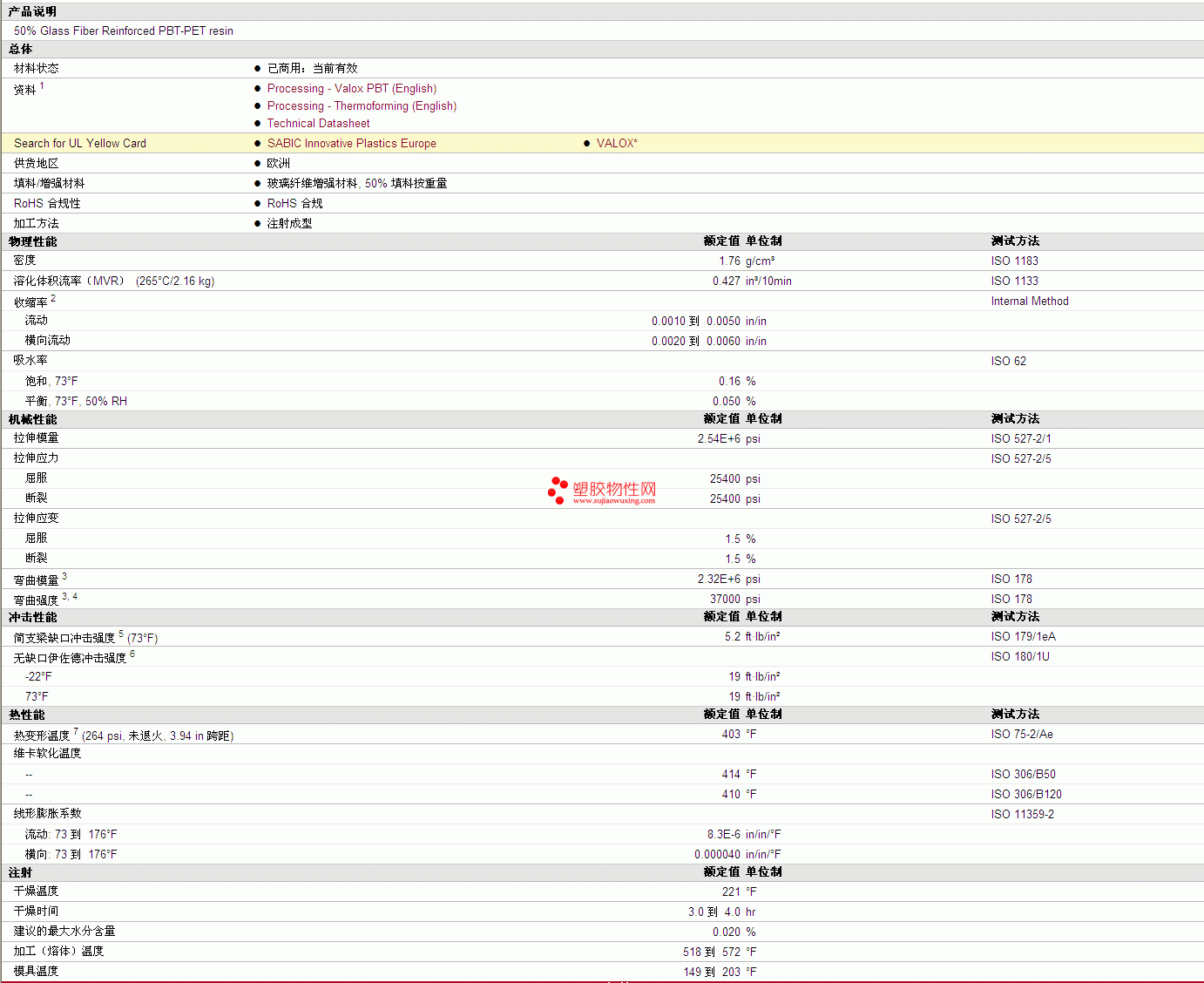| 溶化体积流率(MVR) (265°C/2.16 kg) | 0.427 | in³/10min | ISO 1133 |