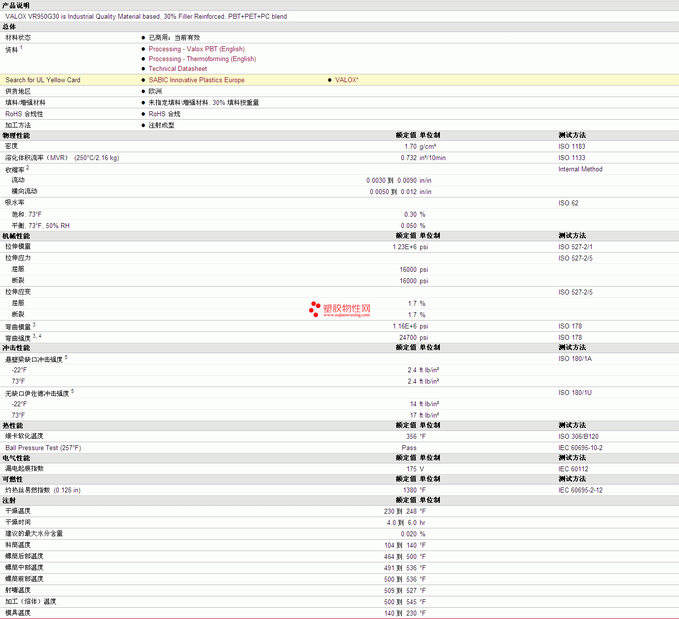 更多VALOX   PET   VR950G30 Resin 物性表报价,图片、材质证明、UL黄卡、物质安全资料表(MSDS)等可来电咨询赵先生:13424755533。或QQ:27660005