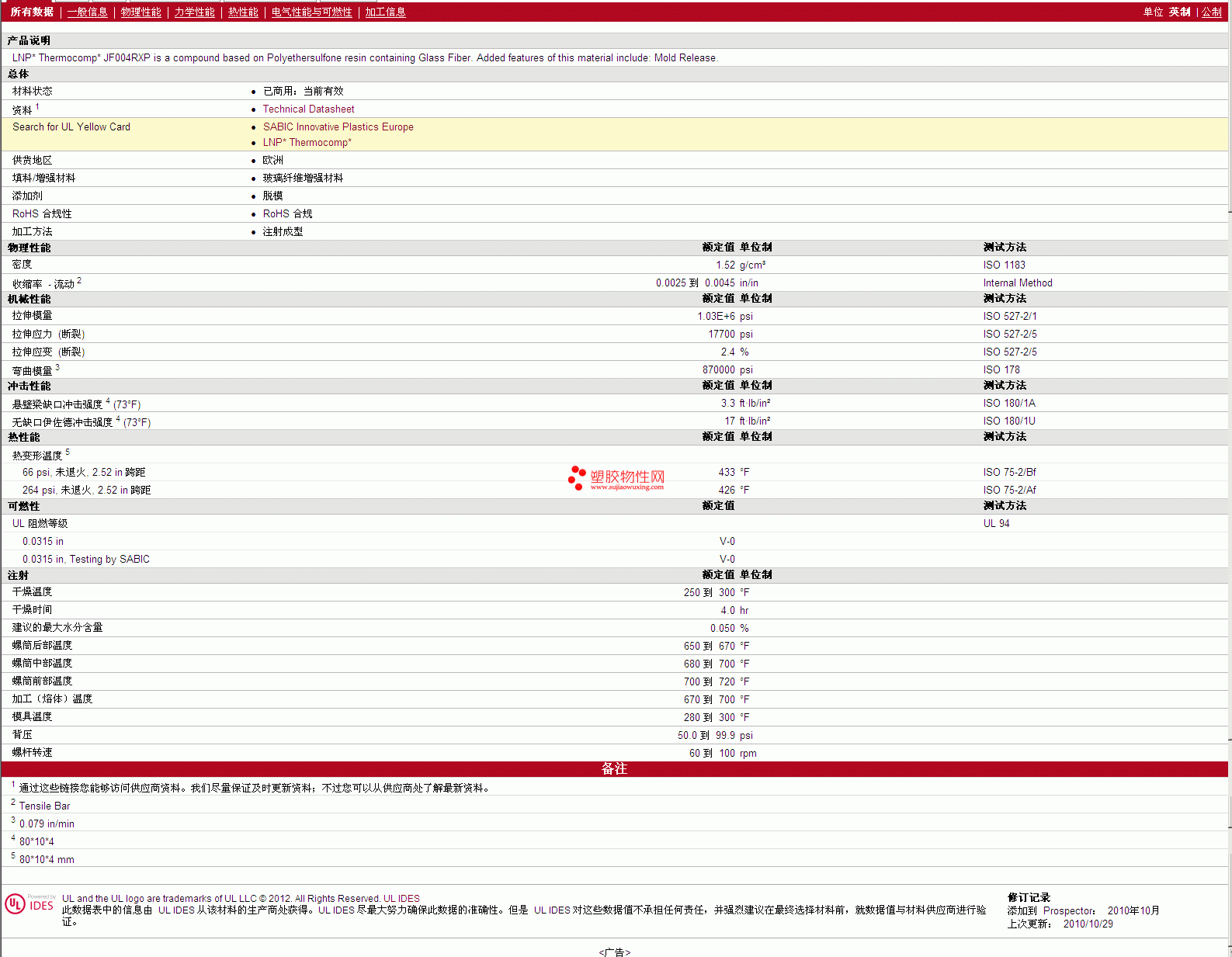 更多 LNP Thermocomp PSU JF004RXP 物性表报价,图片、材质证明、UL黄卡、物质安全资料表(MSDS)等可来电咨询赵先生:13424755533或QQ: 27660005