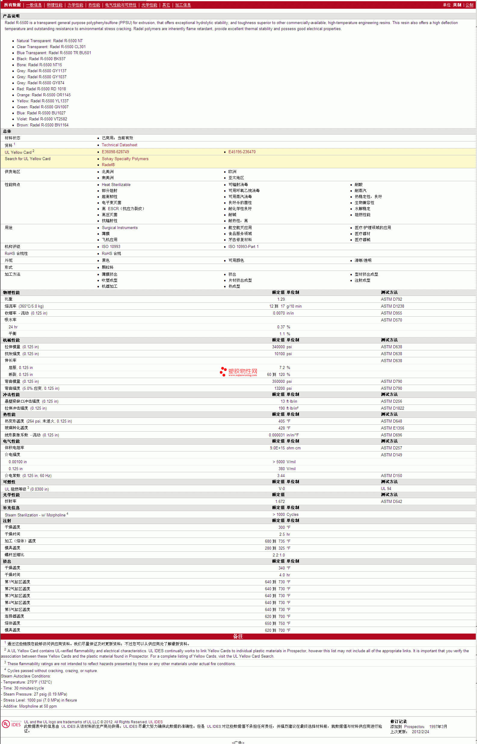 更多Radel PSU R-5500 物性表报价,图片、材质证明、UL黄卡、物质安全资料表(MSDS)等可来电咨询赵先生:13424755533或QQ: 27660005