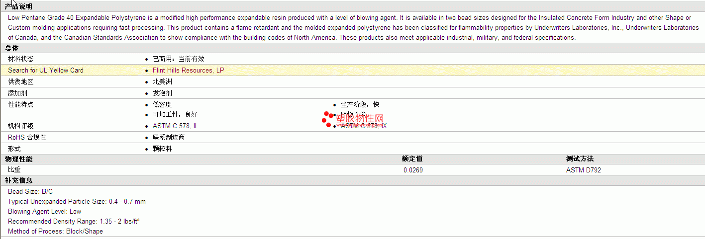 | Bead Size: B/C Typical Unexpanded Particle Size: 0.4 - 0.7 mm Blowing Agent Level: Low Recommended Density Range: 1.35 - 2 lbs/ft³ Method of Process: Block/Shape |