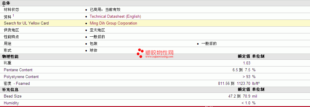 需了解Ming Dih EPS SB物性表更多详情,材质证明、ROHS(SGS)报告、物质安全资料表(MSDS)、UL黄卡等,最新行情报价等可来电咨询:赵先生:13424755533。或QQ:27660005