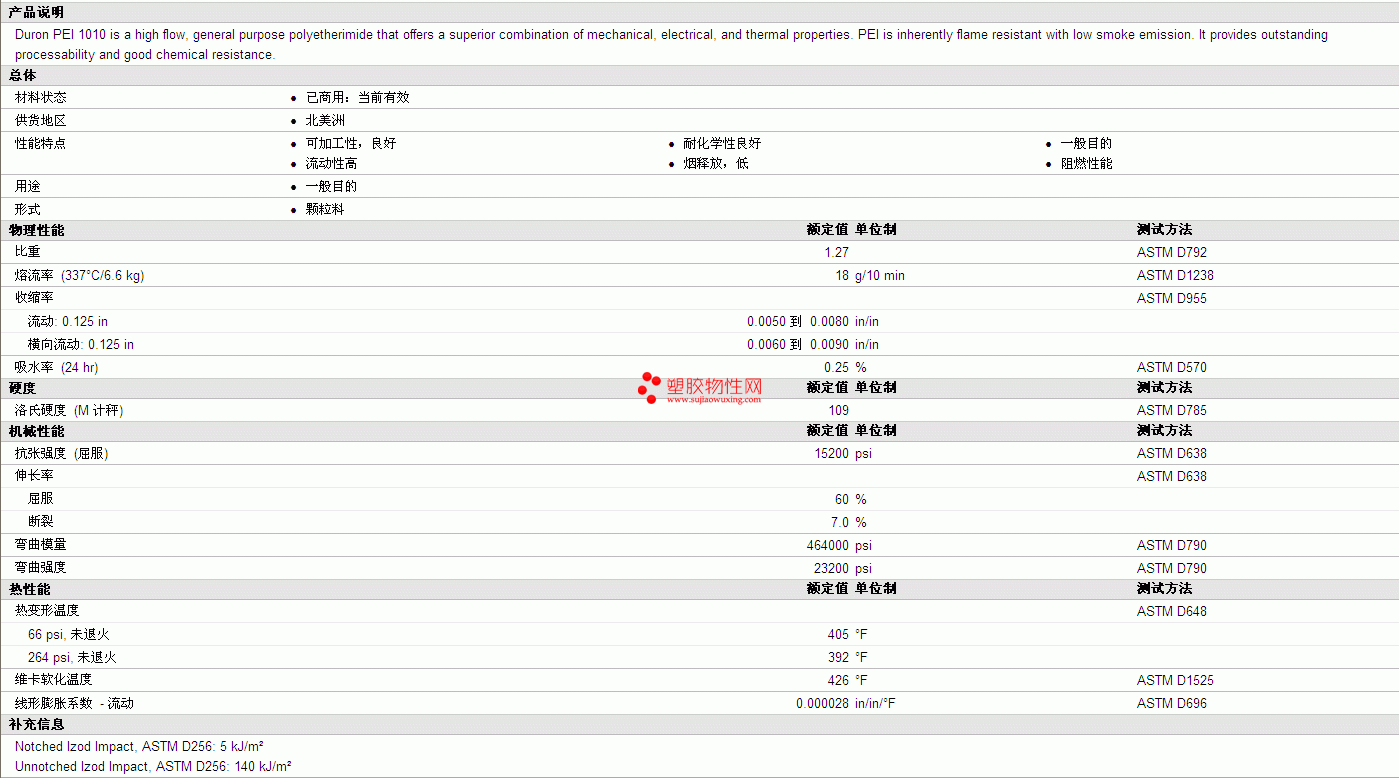更多Duron PEI 1010 物性表报价,图片、材质证明、UL黄卡、物质安全资料表(MSDS)等,最新行情报价等可来电咨询赵先生:13424755533。或QQ:27660005