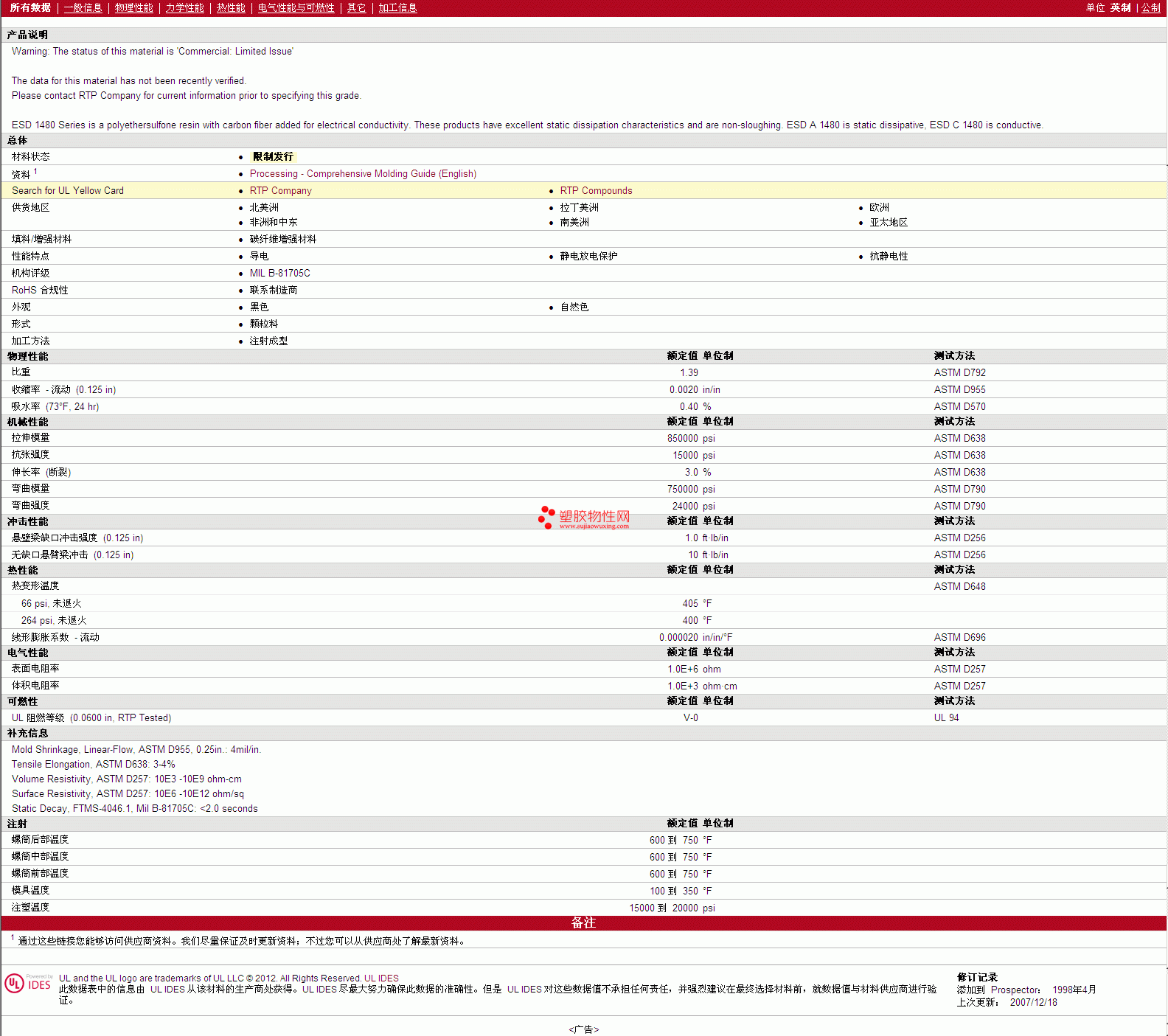需了解RTP Compounds PSU ESD C 1480 N 物性表更多详情,材质证明、ROHS(SGS)报告、物质安全资料表(MSDS)、UL黄卡等,最新行情报价等可来电咨询:赵先生:13424755533或QQ: 27660005