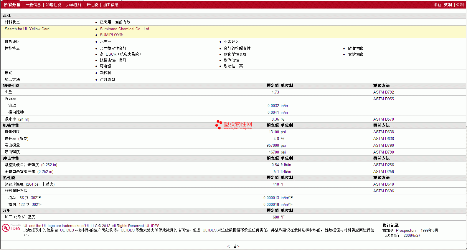 需了解SUMIPLOY PSU MS5620 物性表更多详情,材质证明、ROHS(SGS)报告、物质安全资料表(MSDS)、UL黄卡等,最新行情报价等可来电咨询:赵先生:13424755533或QQ: 27660005
