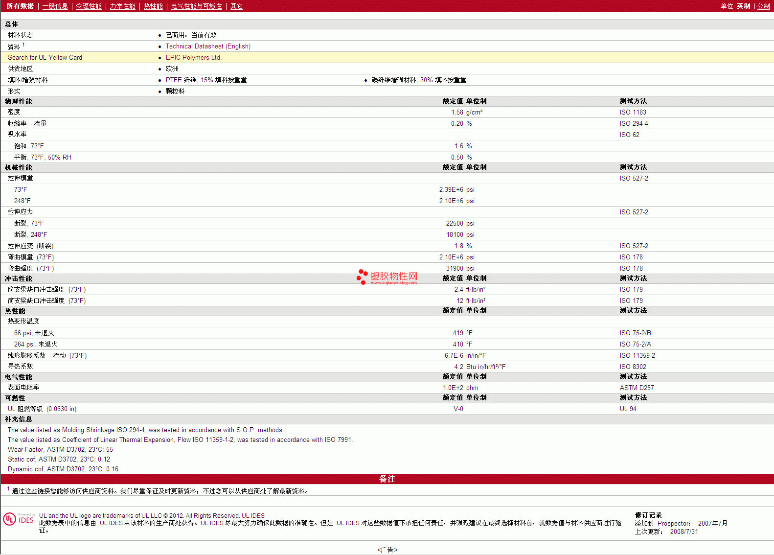 需了解TRIBOCOMP PSU PES CF30 TS0 物性表更多详情,材质证明、ROHS(SGS)报告、物质安全资料表(MSDS)、UL黄卡等,最新行情报价等可来电咨询:赵先生:13424755533或QQ: 27660005