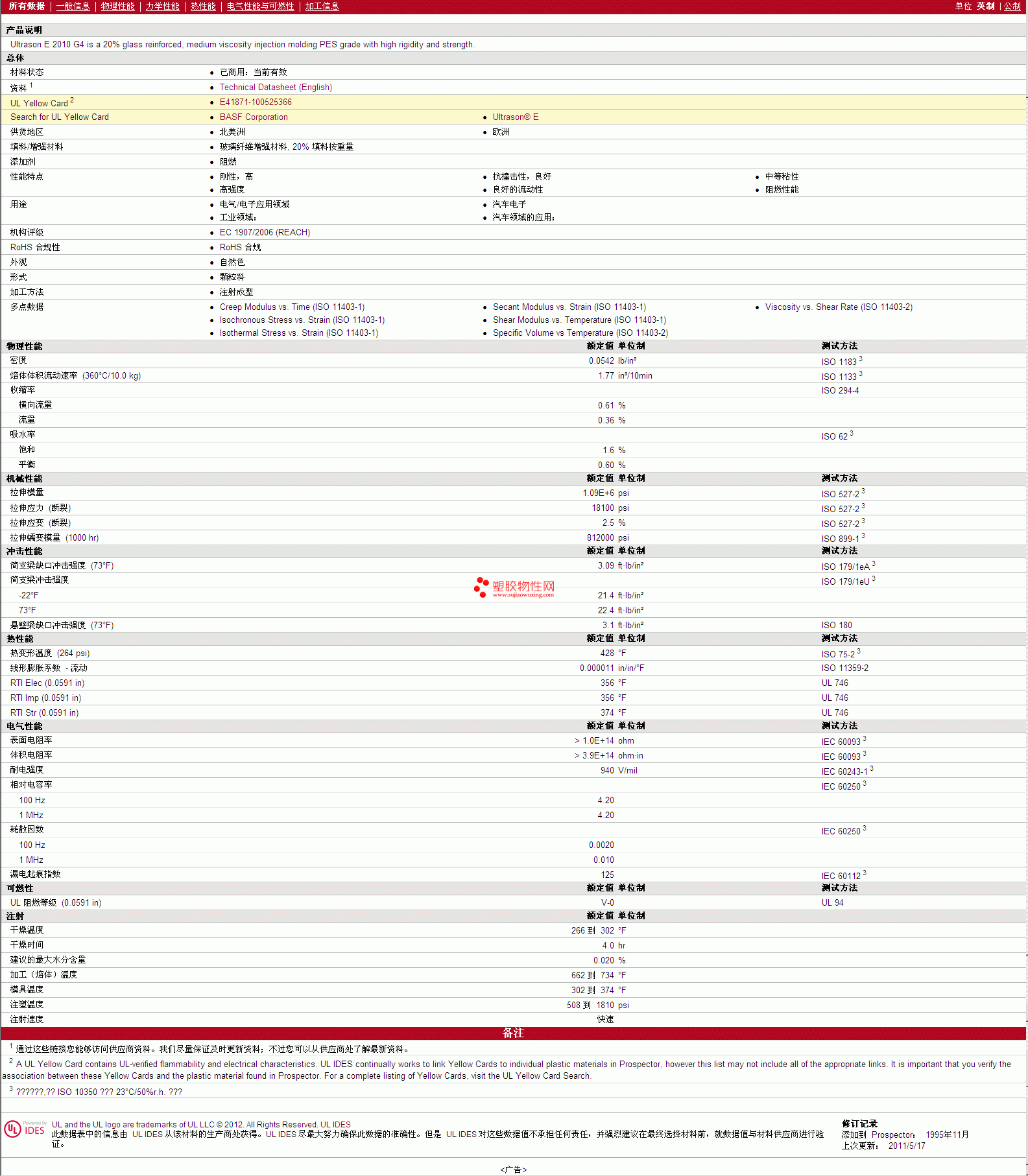 需了解Ultrason PSU E 2010 G4 物性表更多详情,材质证明、ROHS(SGS)报告、物质安全资料表(MSDS)、UL黄卡等,最新行情报价等可来电咨询:赵先生:13424755533或QQ: 27660005