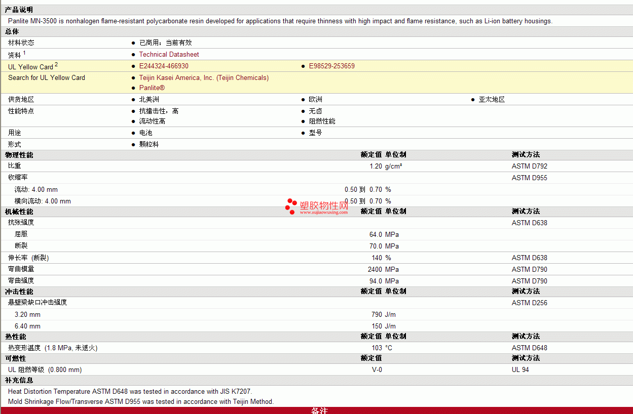 Panlite pc MN-3500物性表 见图片