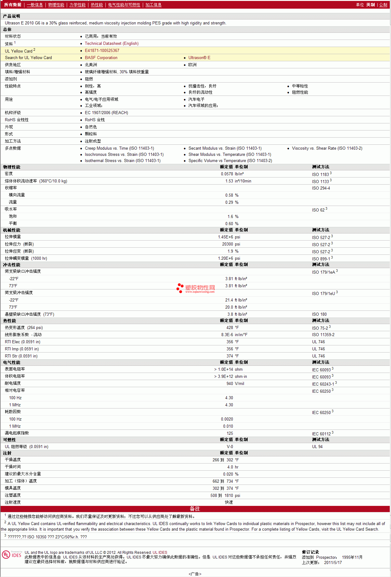 更多Ultrason PSU E 2010 G6 物性表报价,图片、材质证明、UL黄卡、物质安全资料表(MSDS)等,最新行情报价等可来电咨询赵先生:13424755533 或QQ:27660005