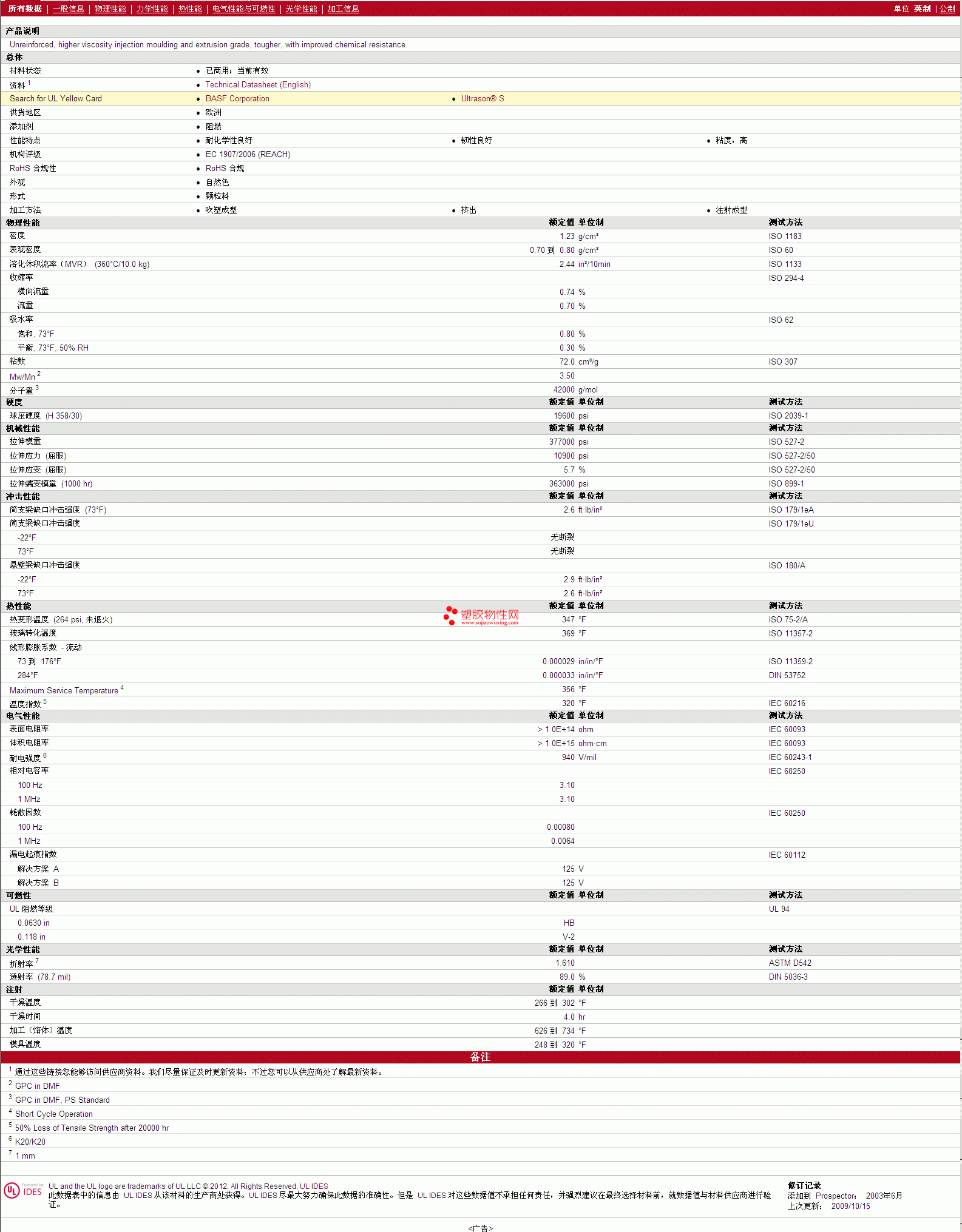 更多Ultrason PSU S 3010 NAT 物性表报价,图片、材质证明、UL黄卡、物质安全资料表(MSDS)等可来电咨询赵先生:13424755533或QQ: 27660005