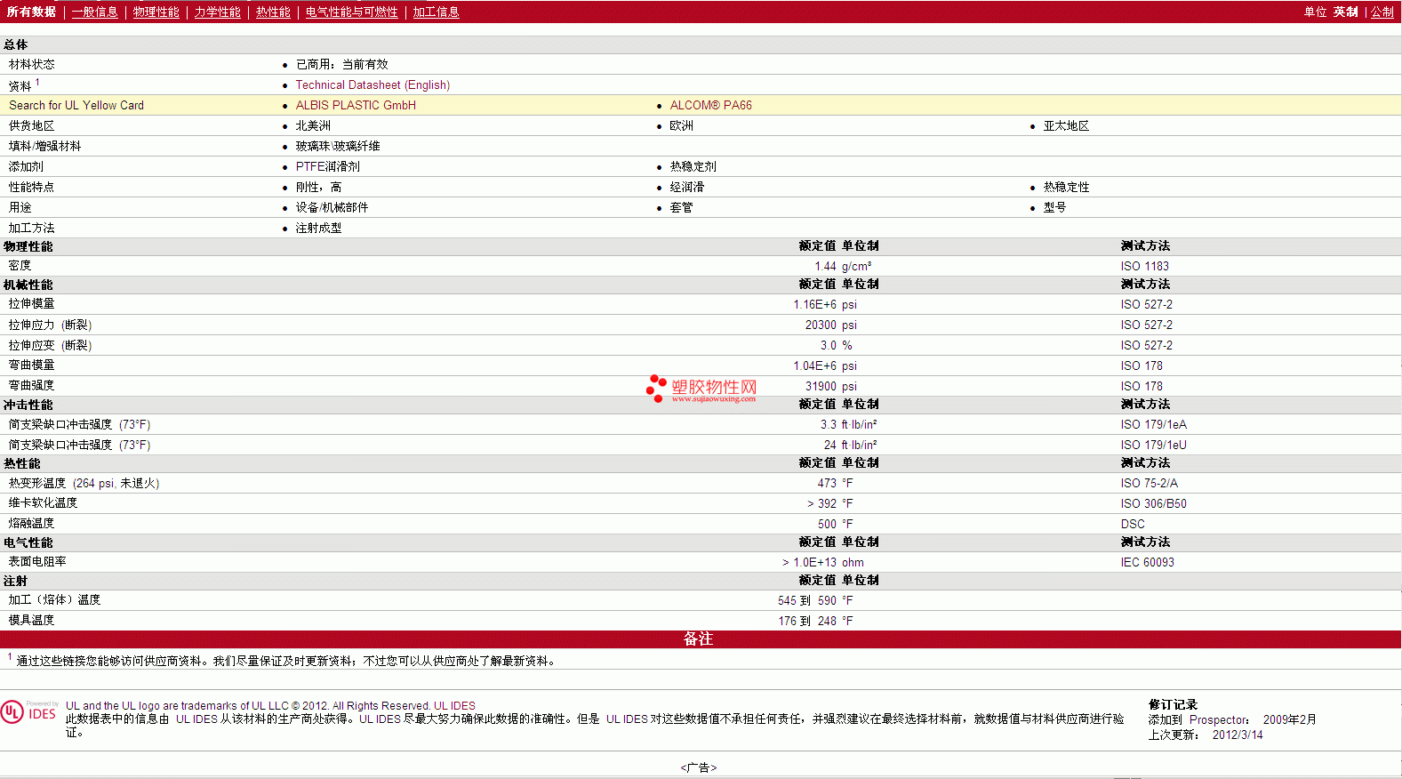 更多ALCOM PTFE PA66 910/1 GF20 GB10 PTFE10 物性表报价,图片、材质证明、UL黄卡、物质安全资料表(MSDS)等可来电咨询赵先生:13424755533或QQ: 27660005