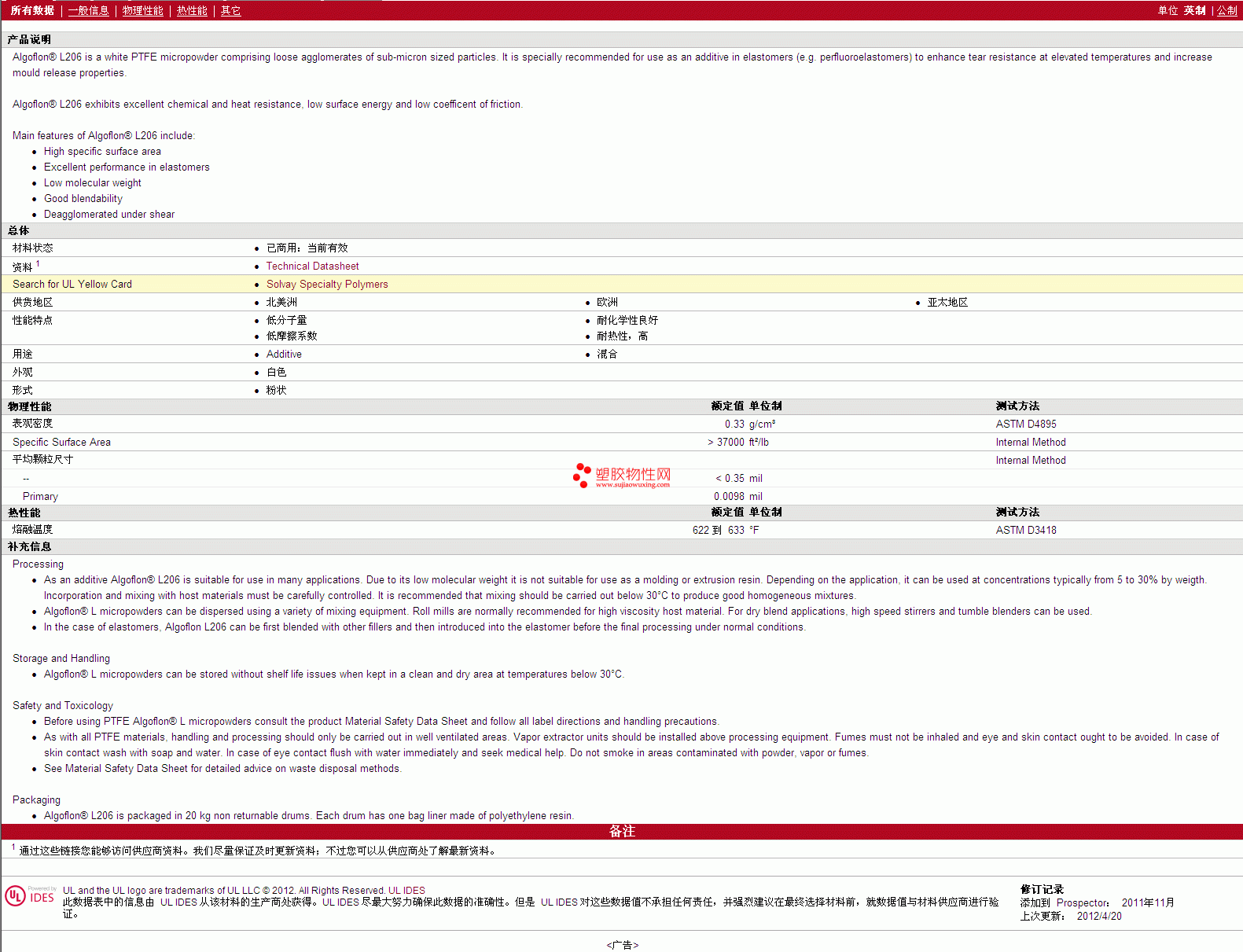 更多Algoflon PTFE L206 物性表图片,报价、物质安全资料表(MSDS)、材质证明、UL黄卡等,最新行情报价等可来电咨询赵先生:13424755533或QQ: 27660005