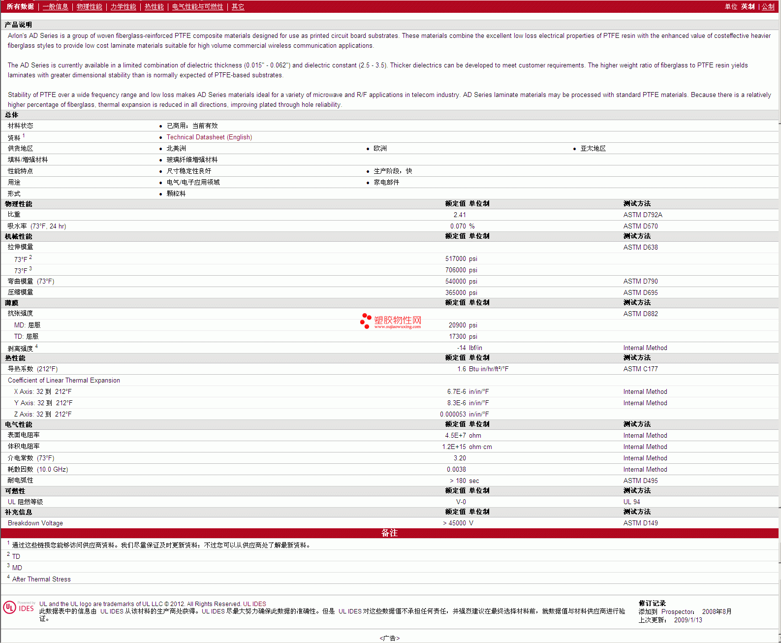 更多Arlon PTFE AD320 物性表报价,图片、材质证明、UL黄卡、物质安全资料表(MSDS)等,最新行情报价等可来电咨询赵先生:13424755533或QQ: 27660005