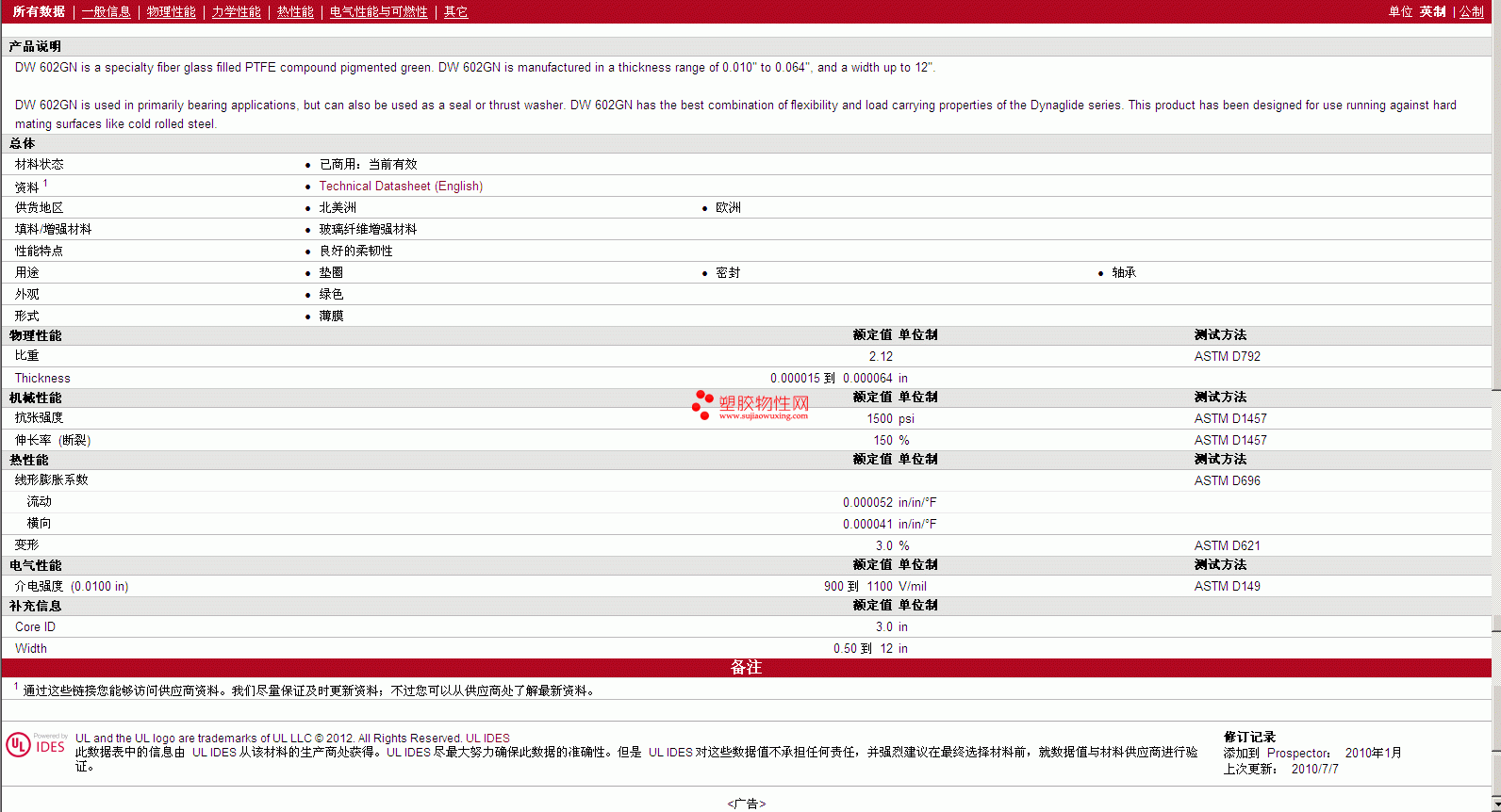 需了解Dynaglide PTFE D/W 602GN 物性表材质证明、ROHS(SGS)报告、物质安全资料表(MSDS)、UL黄卡等可来电咨询:赵先生:13424755533或QQ: 27660005