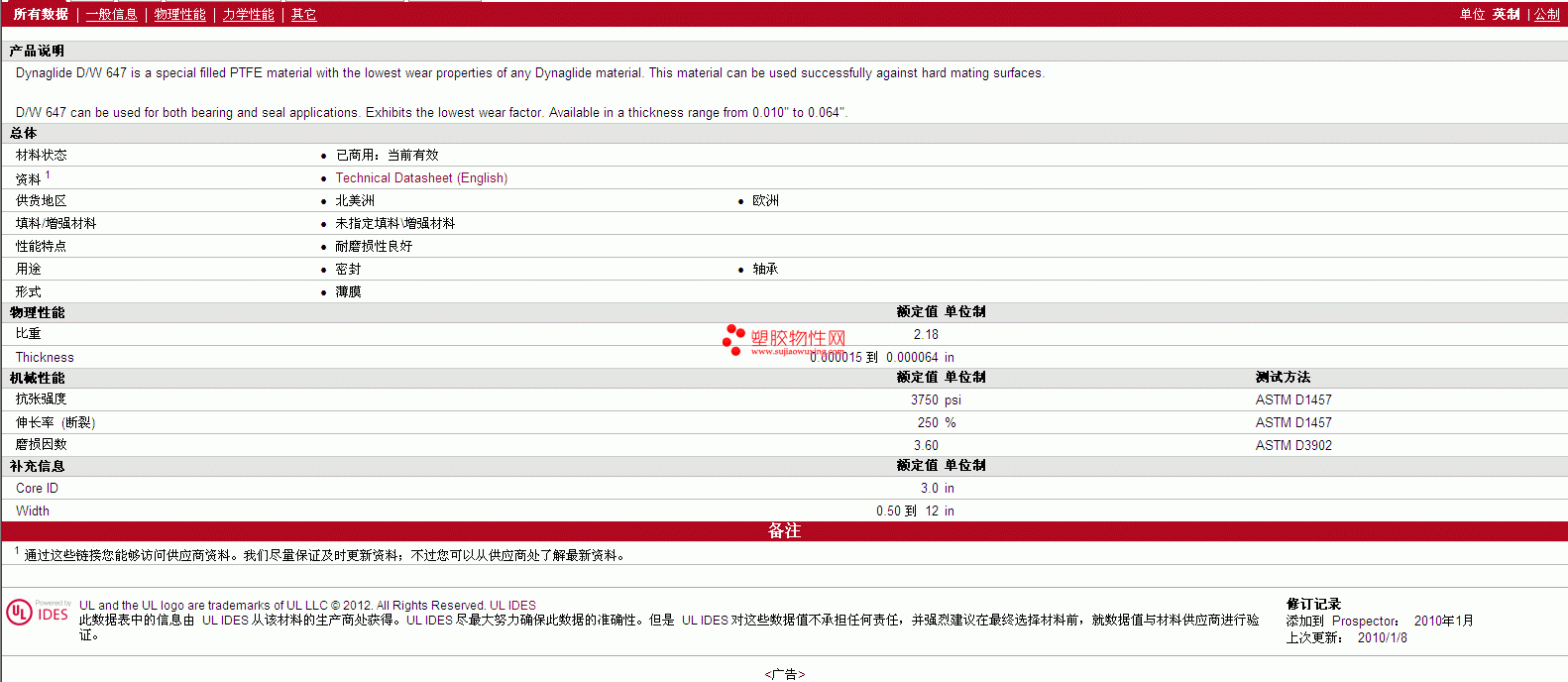 如需了解 Dynaglide PTFE D/W 647 物性表更多详情,ROHS(SGS)报告、物质安全资料表(MSDS)、材质证明、UL黄卡等,最新行情报价等可来电咨询:赵先生:13424755533或QQ: 27660005