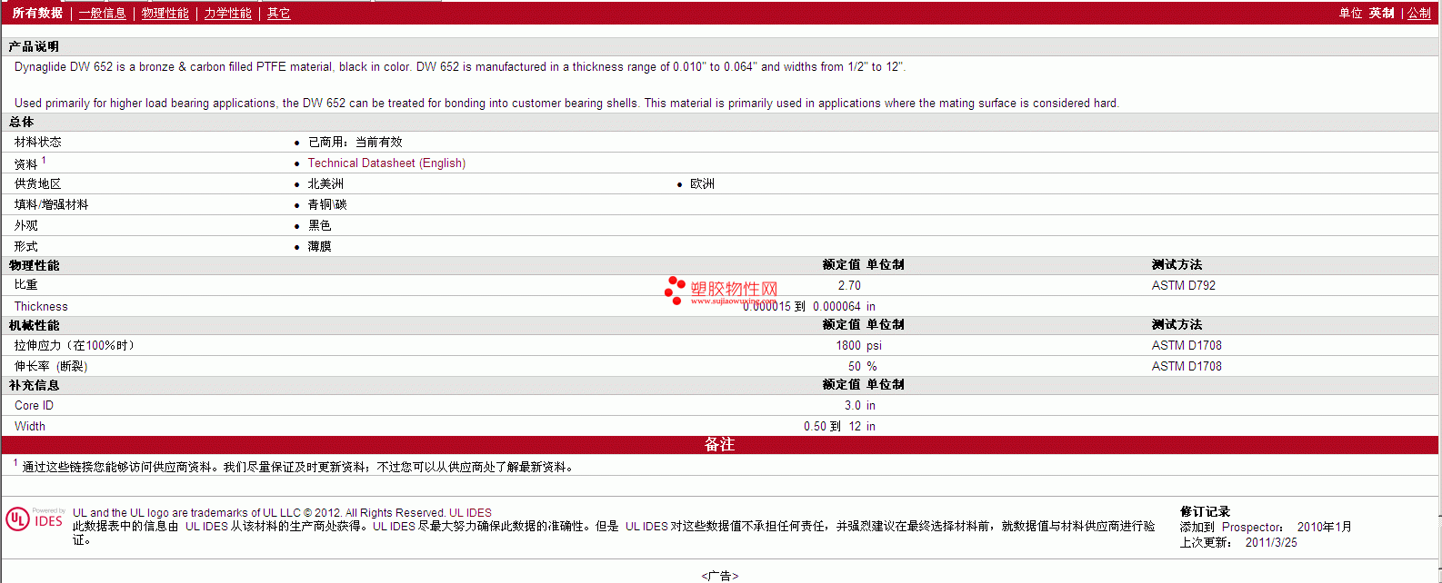 更多Dynaglide PTFE DW 652 物性表图片,报价、物质安全资料表(MSDS)、材质证明、UL黄卡等,最新行情报价等可来电咨询赵先生:13424755533或QQ: 27660005