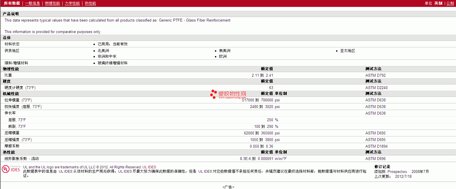 更多Generic PTFE - Glass Fiber Reinforcement 物性表图片,报价、物质安全资料表(MSDS)、材质证明、UL黄卡等,最新行情报价等可来电咨询赵先生:13424755533或QQ: 27660005