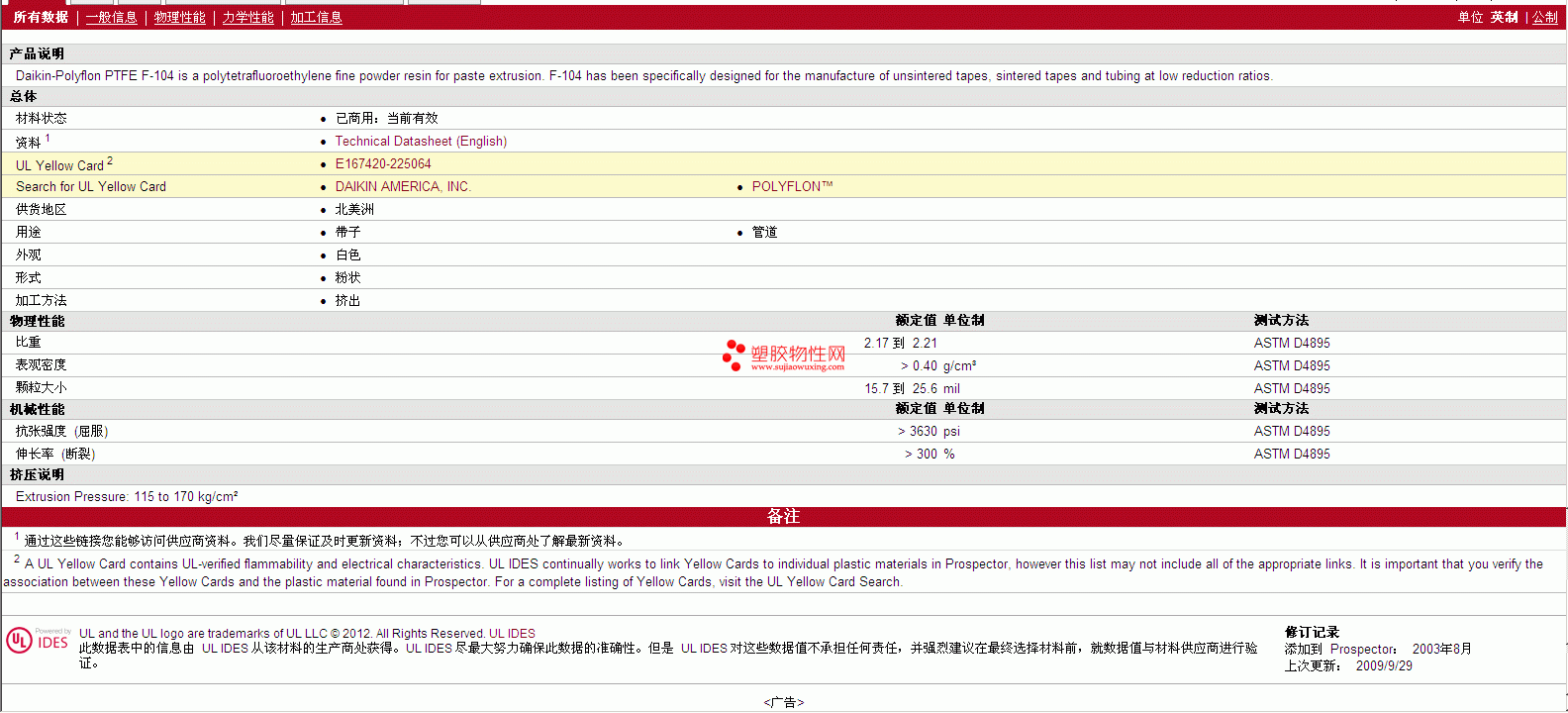 更多 POLYFLON PTFE F-104 物性表报价,图片、材质证明、UL黄卡、物质安全资料表(MSDS)等可来电咨询赵先生:13424755533或QQ: 27660005